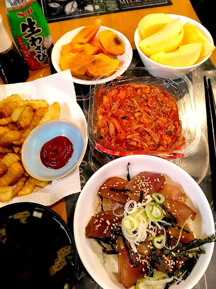 体調悪く私はフルーツのみ。冷凍庫にあったマグロで丼物作りました😷