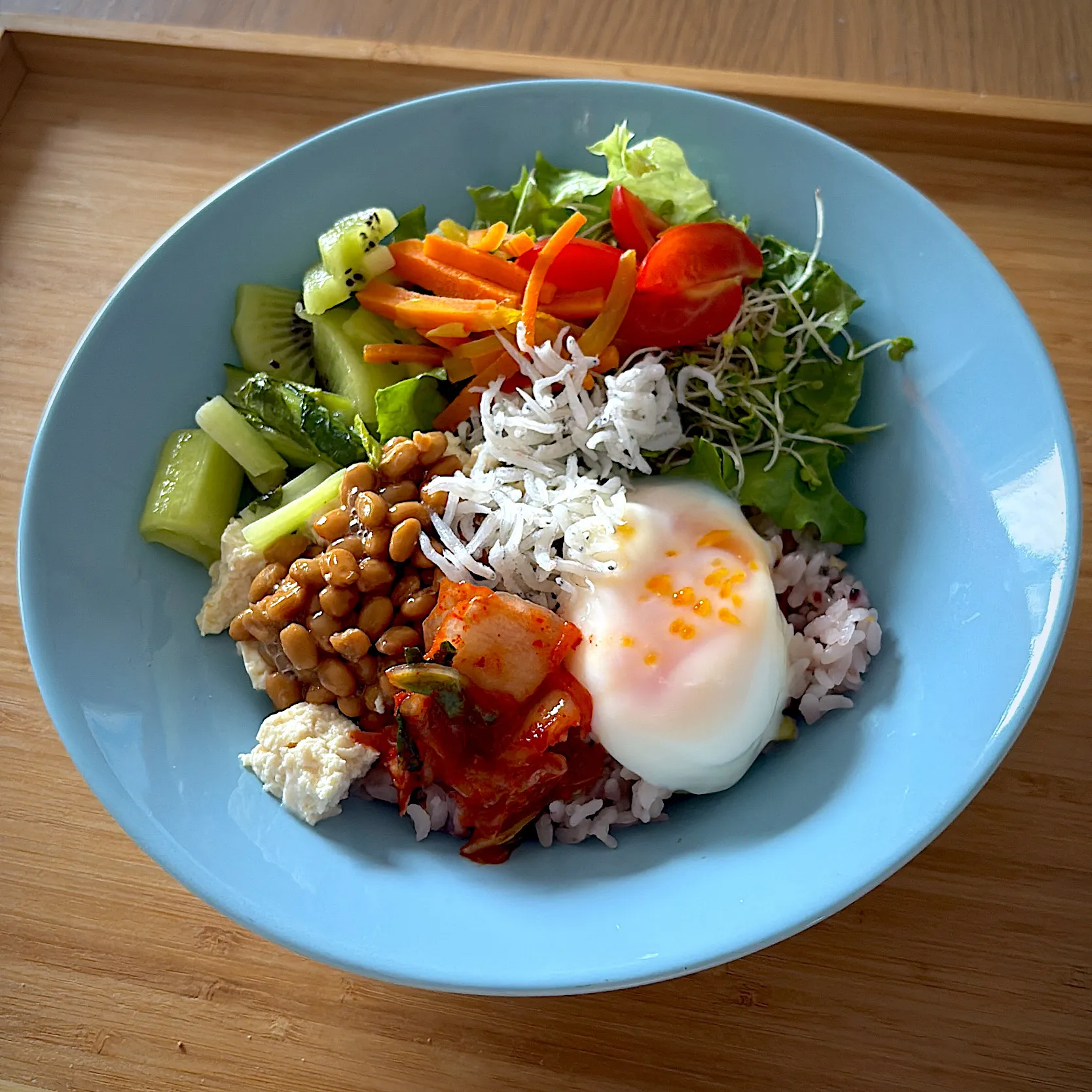 生野菜サラダには小松菜おひたし・人参と玉ねぎのカレー粉炒め・キウイフルーツを盛り付けました。