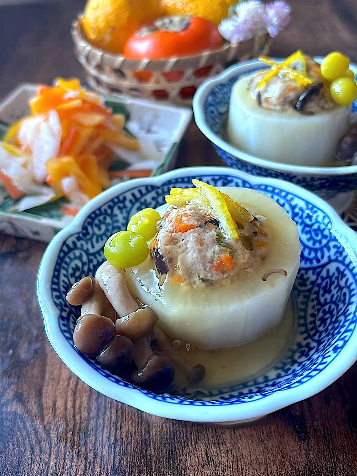 くりぬいた大根の中にひき肉を詰め込んだ射込みは、箸でも食べられるほど柔らかく炊いてます。