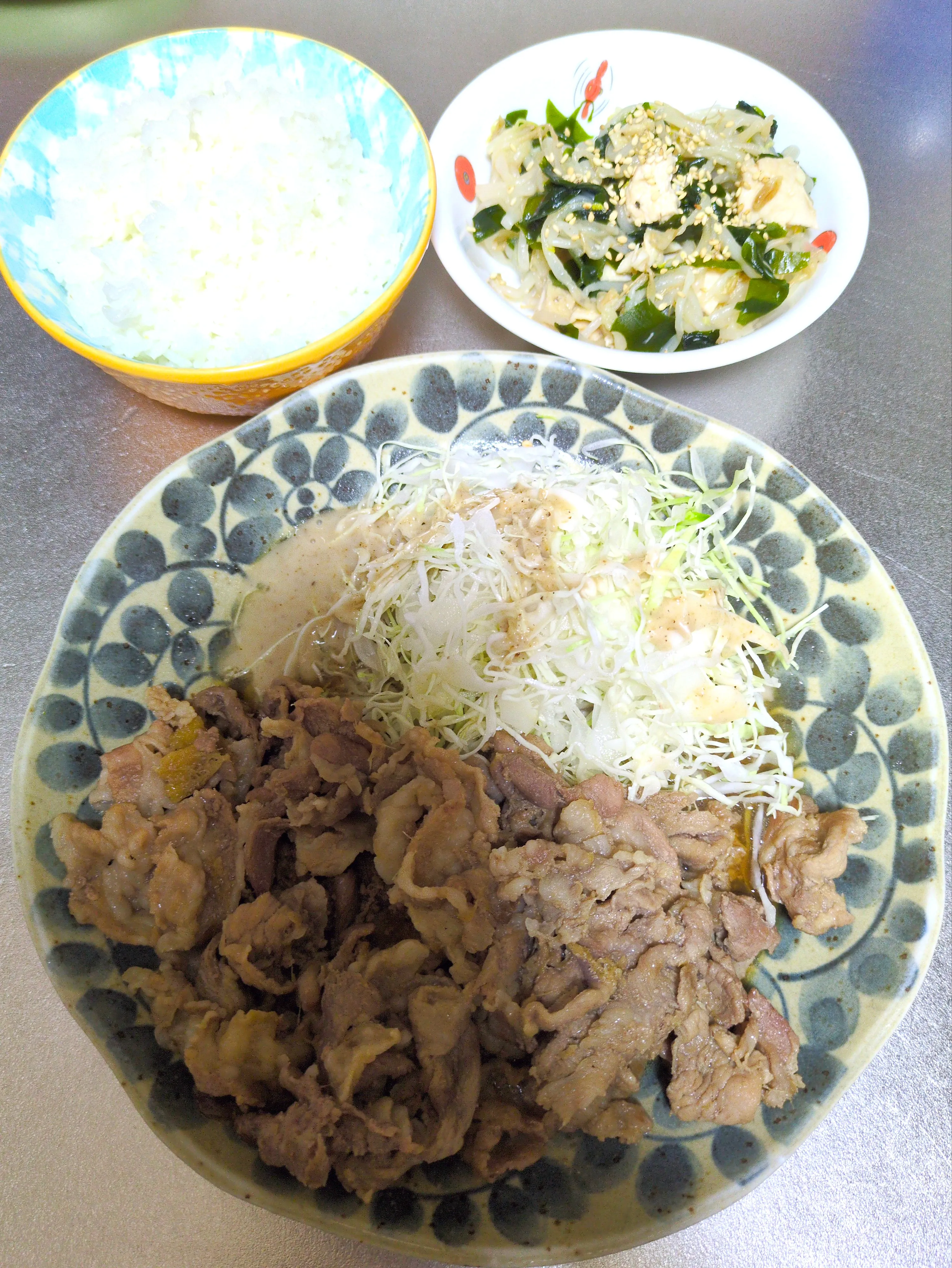 #豚こま肉#しょうが#酒#みりん#砂糖#醤油#しょうが#キャベツ#鶏ハム#もやし#わかめ#青じそドレッシング