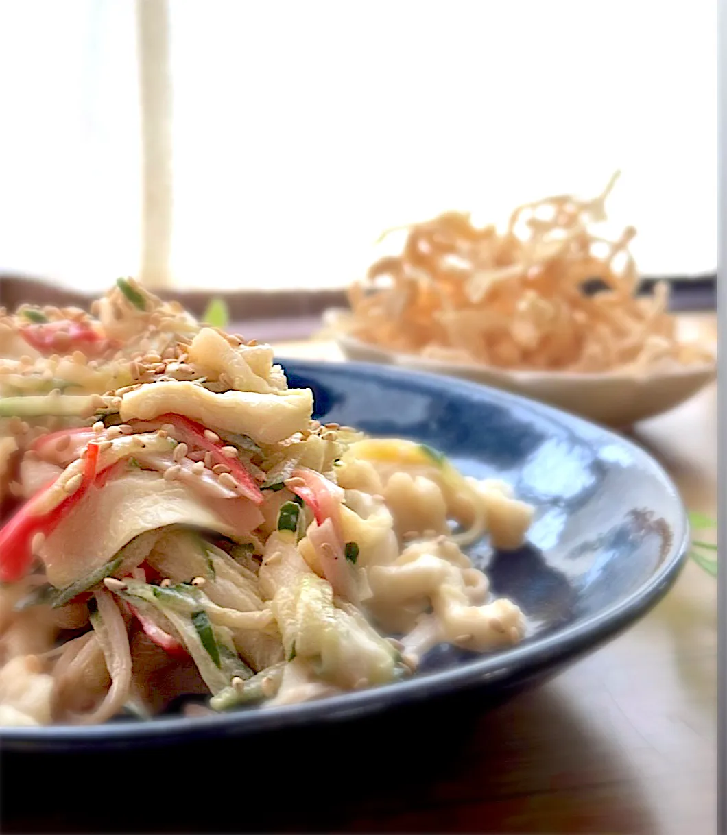 切り干し大根戻して絞るきゅうりを切って絞るカニカマさいてマヨネーズとポン酢混ぜて胡麻振って出来上がり