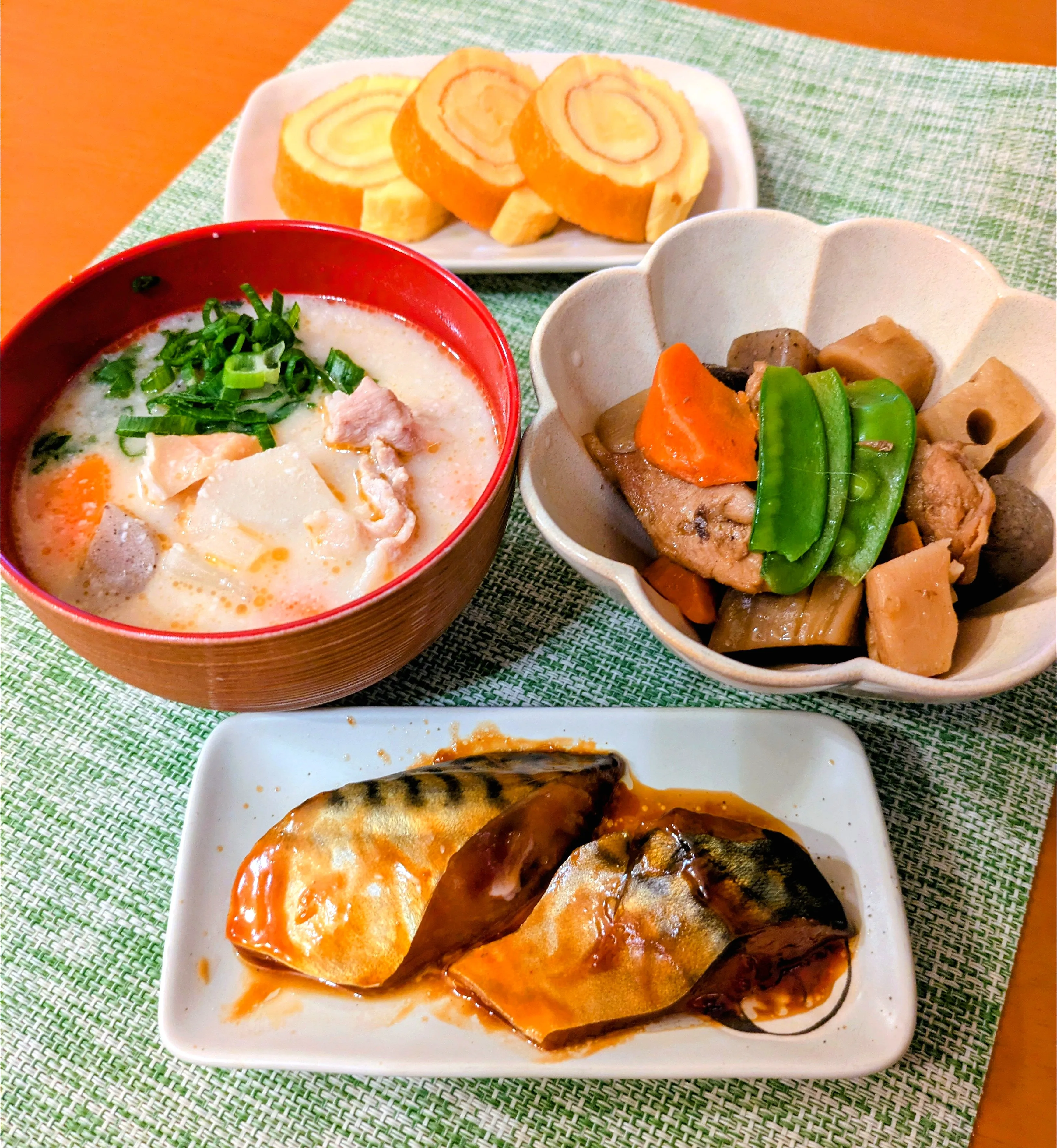 #夕食#鯖照り焼き#筑前煮#粕汁#伊達巻