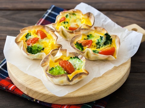 餃子の皮をパイ生地の代わりに使用して簡単に作るミニキッシュ。「ヤマサ ぱぱっとちゃんと これ!うま!!つゆ」で味付けすることで、和DEミックスな味わいに。