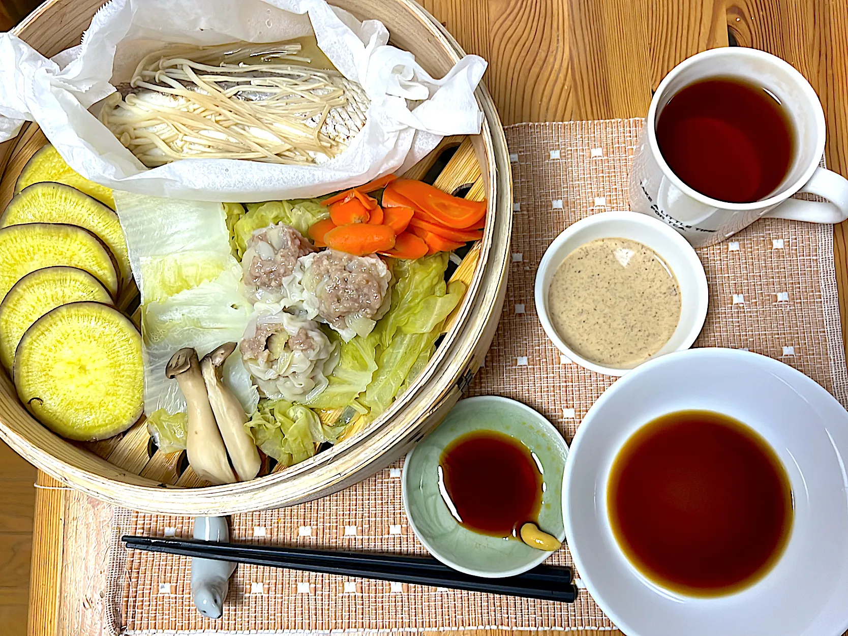 家にある物を蒸しただけです。お芋にはゴマだれがおすすめ。