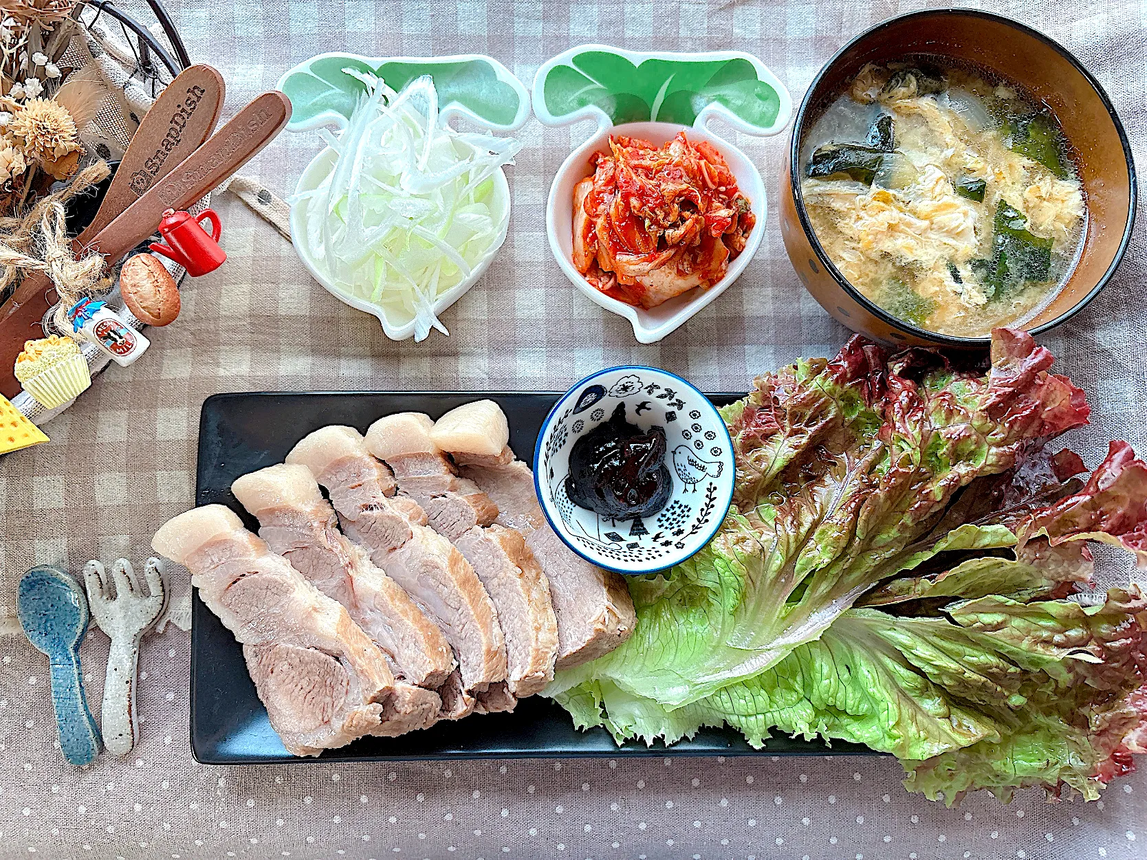お肉は豚肩ロースブロックを使用し具材と共に45分煮込み、サニーレタス・キムチ・ネギ・サムジャンと一緒にいただきました♪