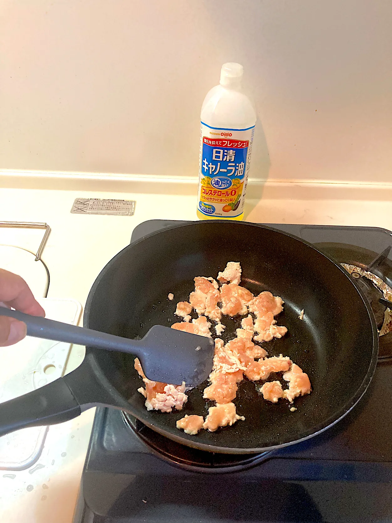 今日の晩ご飯③ 鶏むね挽き肉を炒めます