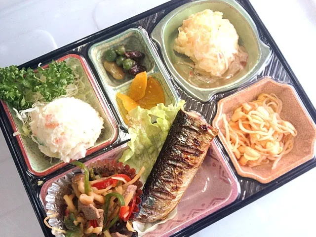サンマの塩焼き カニと豆腐のふんわり天 もやしナムル ポテトサラダ 漬け物他