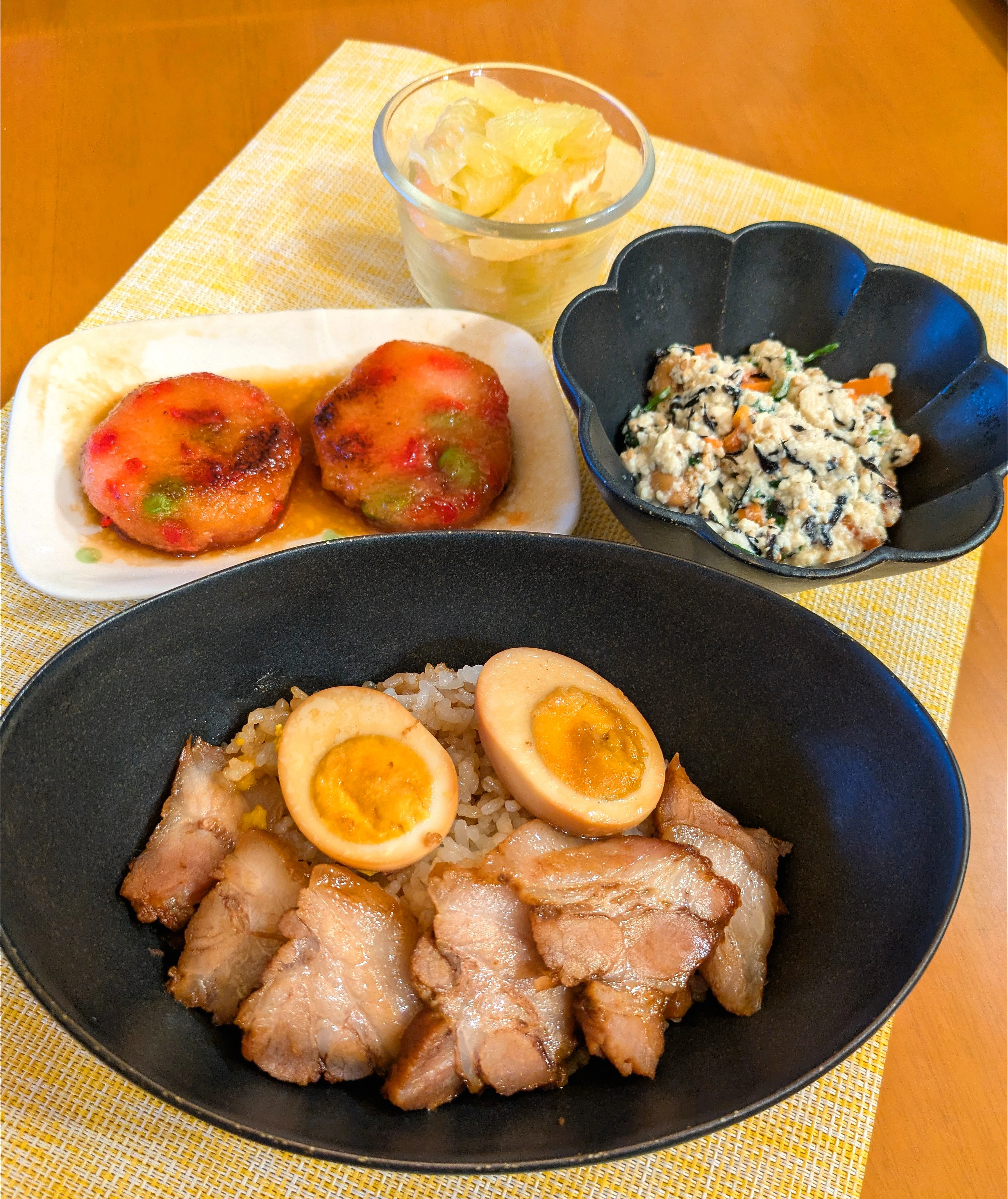 #夕食#煮豚#丼#白和え#大根餅#文旦