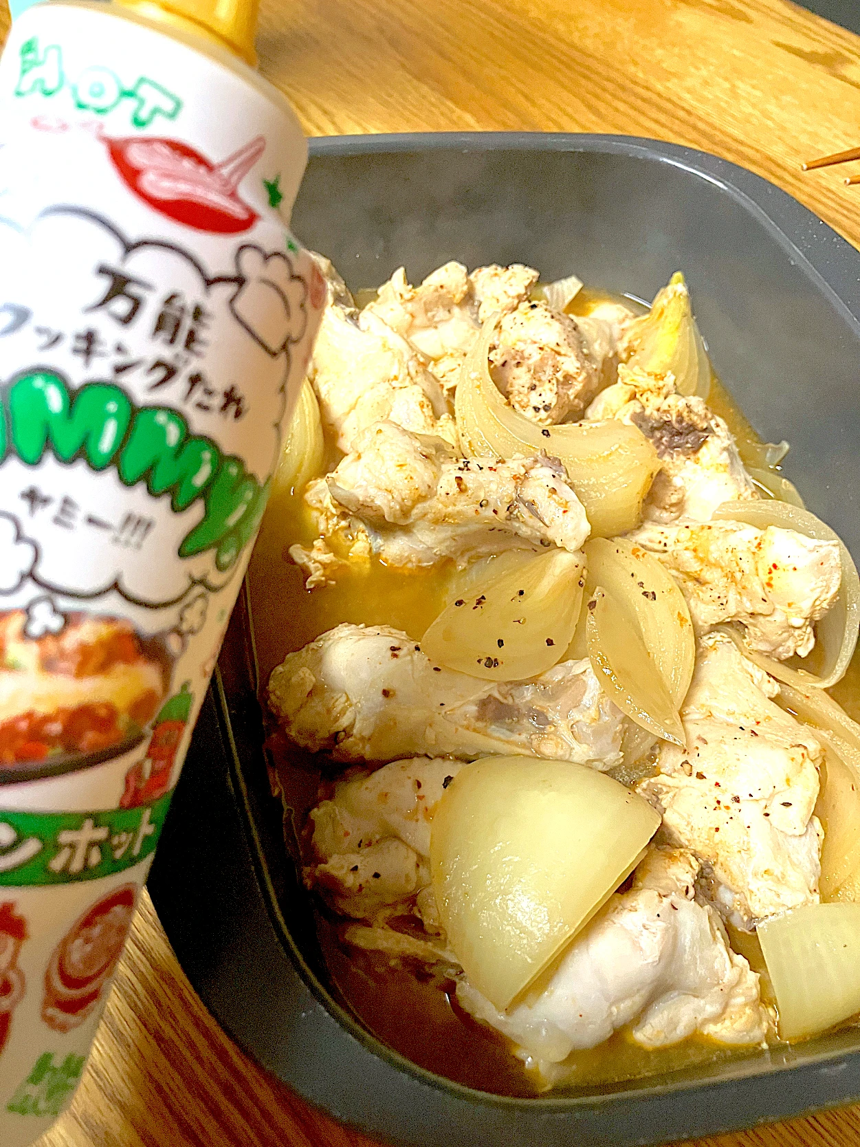 冷蔵庫にあった手羽元をコリアンホットと水で煮込んだだけ。