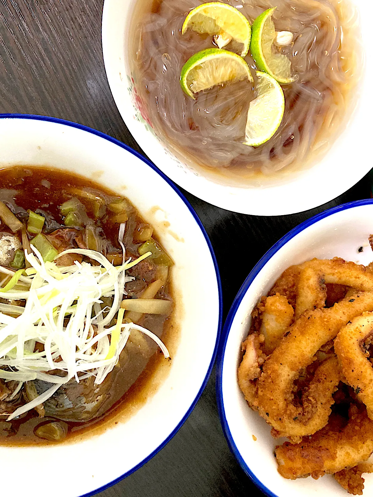 イカゲソ唐揚げ、サバ味噌煮、ところてん
