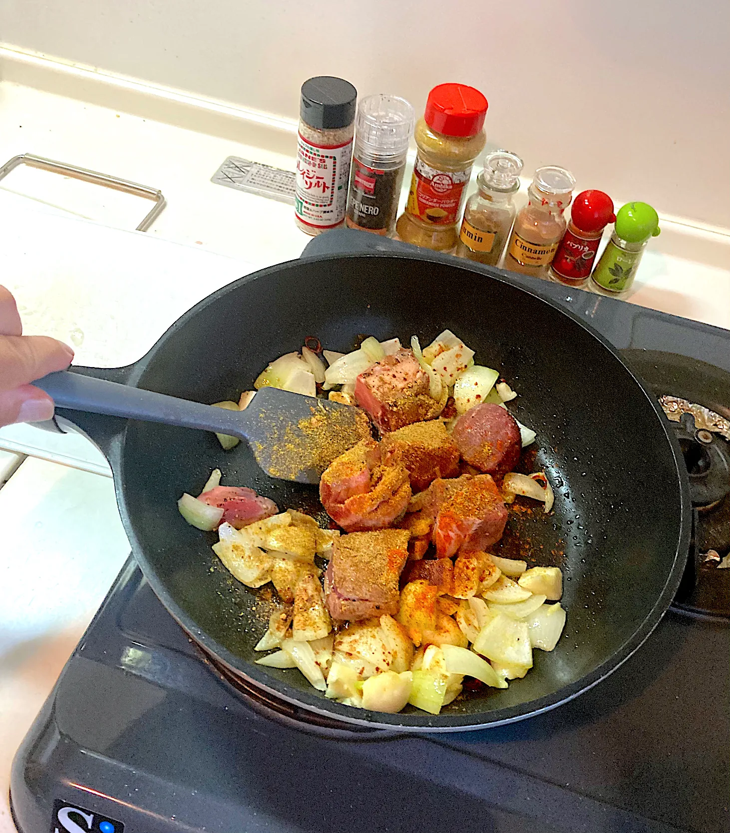 今日の晩ご飯⑤ タジン鍋がないので、いつものフライパンにたっぷりのオリーブオイルをひき、玉ねぎ、ニンニク、唐辛子を炒め、香りが立ってきたところで塩胡椒した山羊肉を投入し、クミン、コリアンダー、ローリエ、パプリカ、シナモンを振り、さらに炒めます。