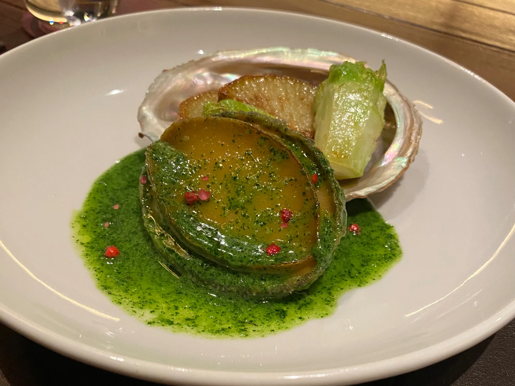 煮鮑の海老味噌がけ 白髪葱  と