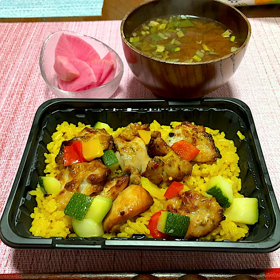 #晩ご飯 #オーケー弁当購入 #温めたので #ポチッとした #味噌汁 #お湯入れただけ #紫大根甘酢漬け #楽々