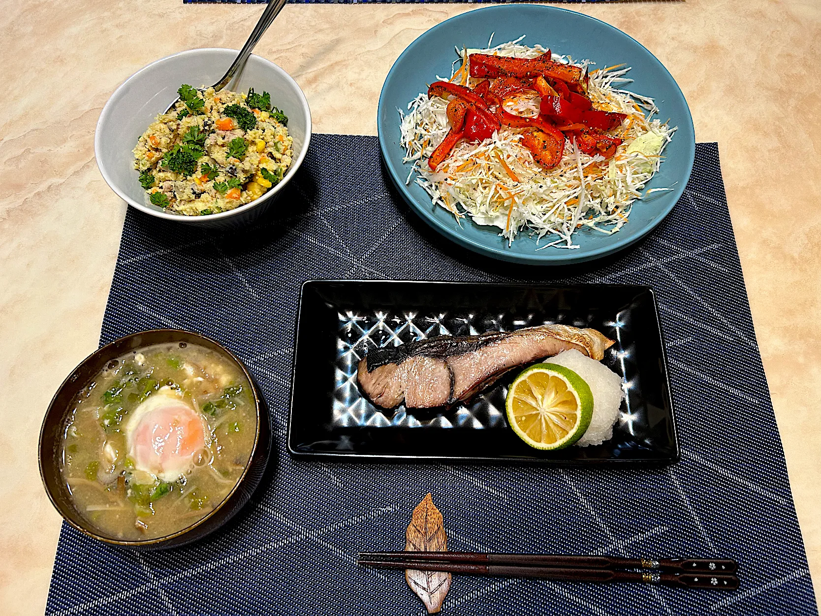 お夕飯 鰹のたたき・カボチャサラダ・厚揚げお好み焼き...