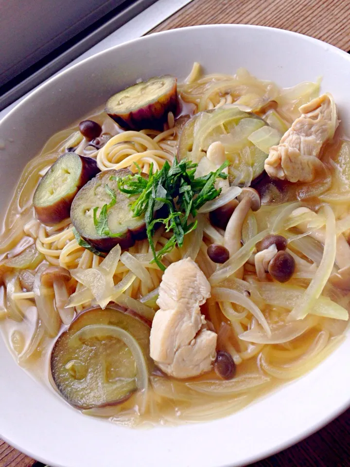 そろそろ固形物も食べたくなったので、パスタを作りました。茄子、玉ねぎ、しめじ、鶏のささみを入れて大葉を彩に。