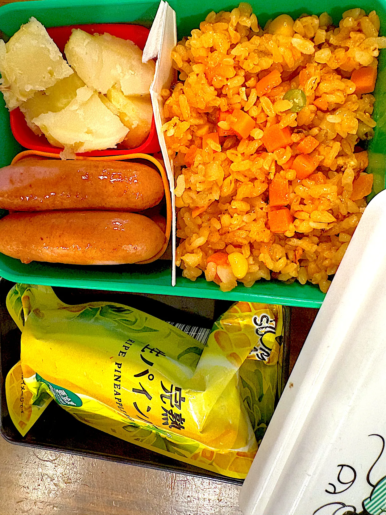ポテトのカレー味はレンチンの下ごしらえしようとしたらラップなし⤵️ デザートは手抜き。セブンイレブン。毎日入れるには高いけど。手も汚れず食べらます💕 #お弁当