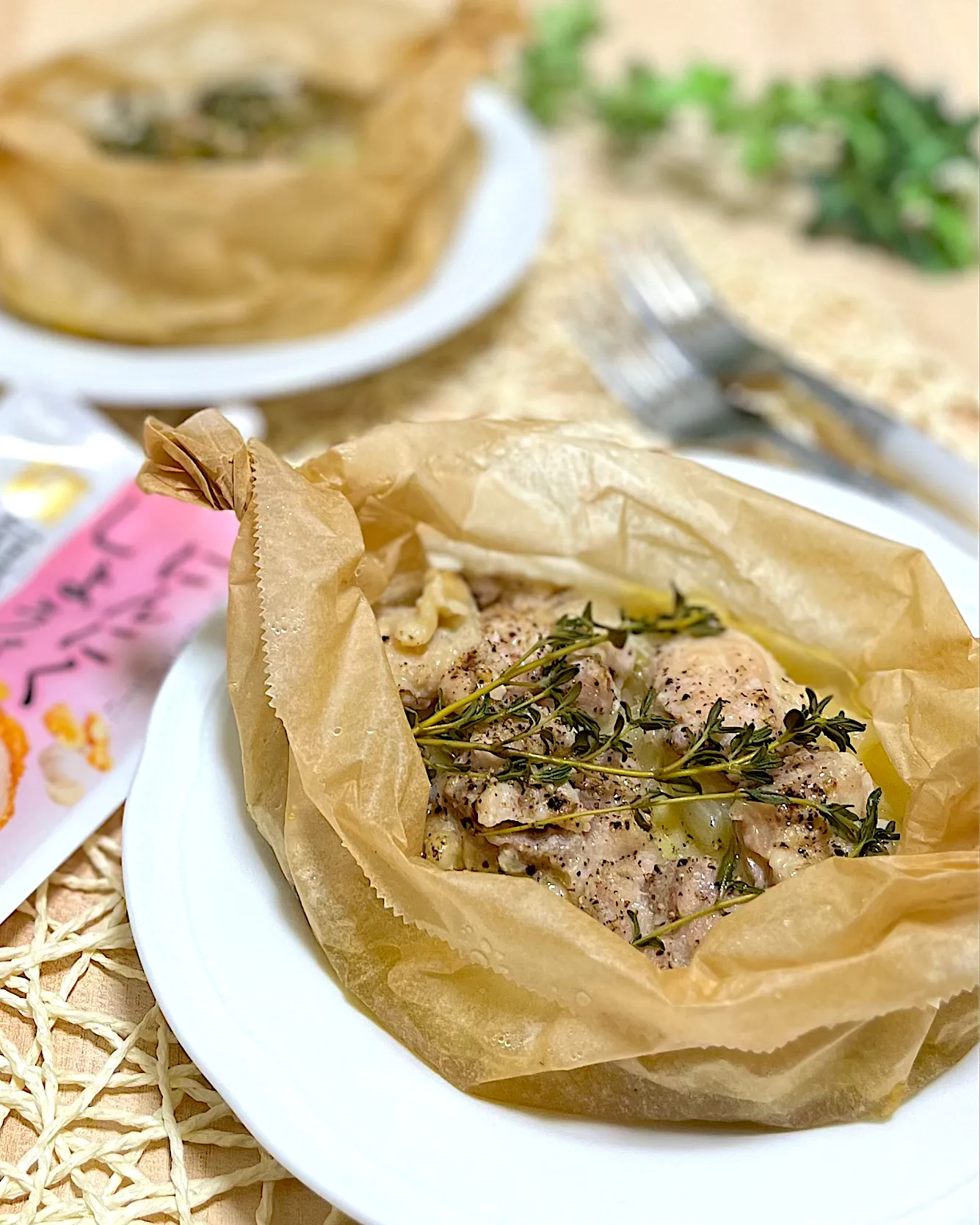 鶏もも肉ににんにくしょうが生塩糀を揉みこんで下味をつけたら、材料をクッキングペーパーで包み蒸籠で10分