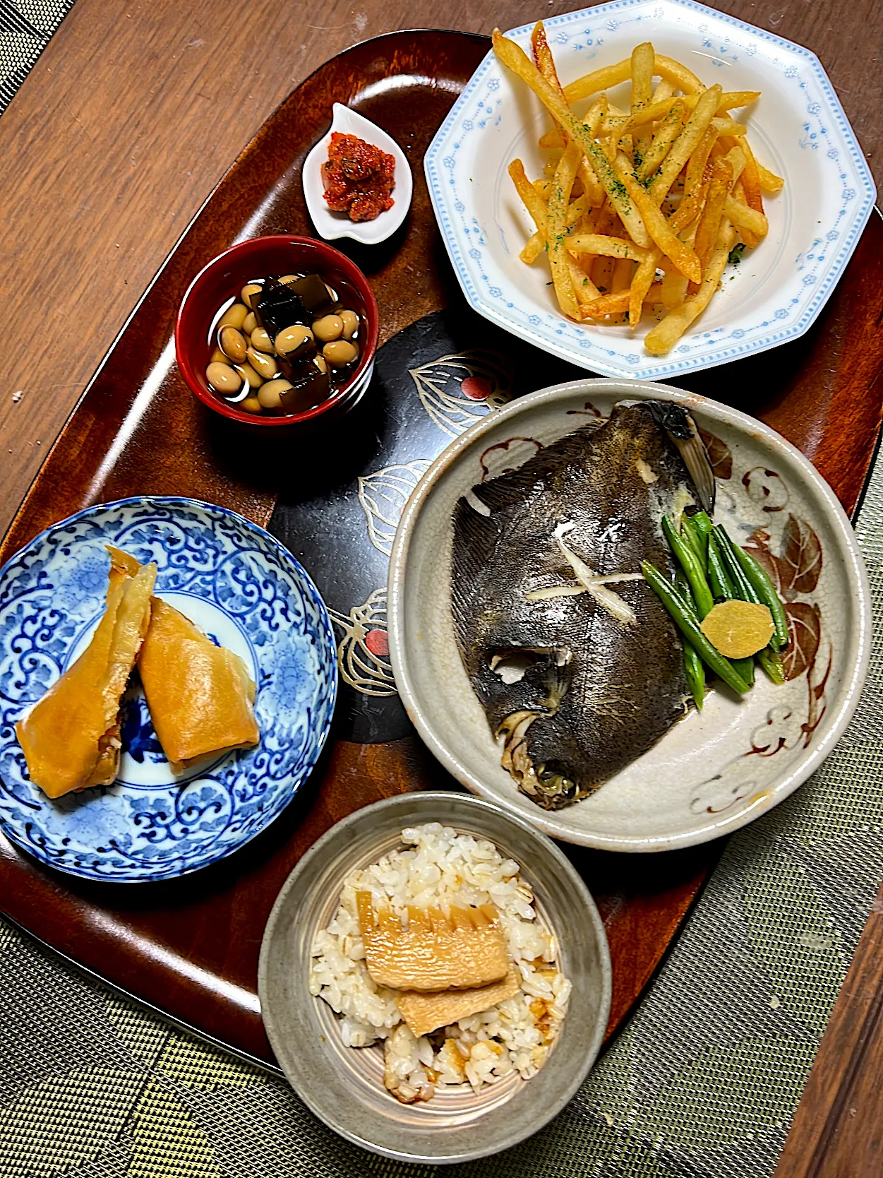 メイタカレイ煮 春巻き ポテトフライ 煮豆 明太キムチ