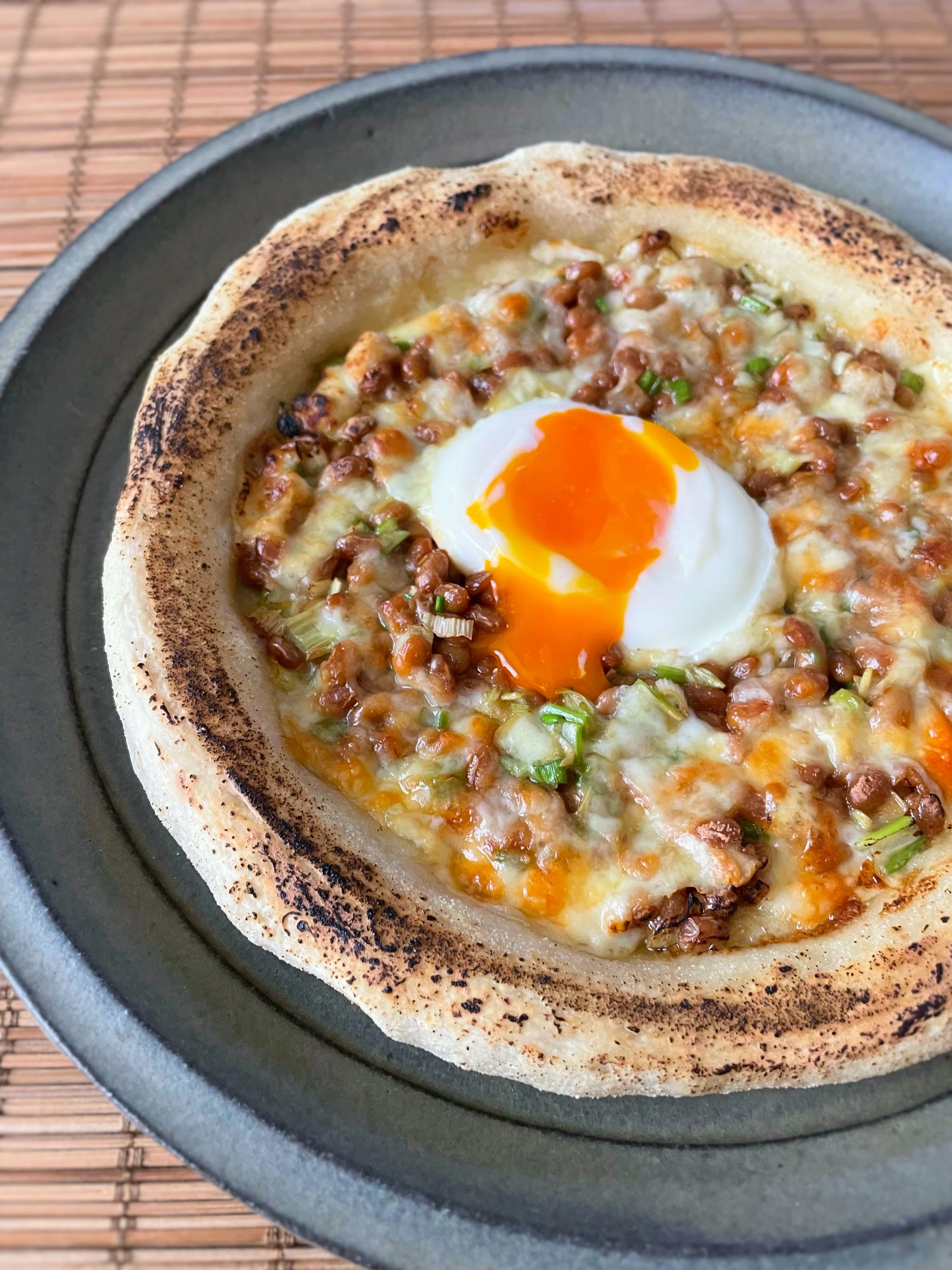 納豆ピザに玉子をのせたビスマルクスタイル。