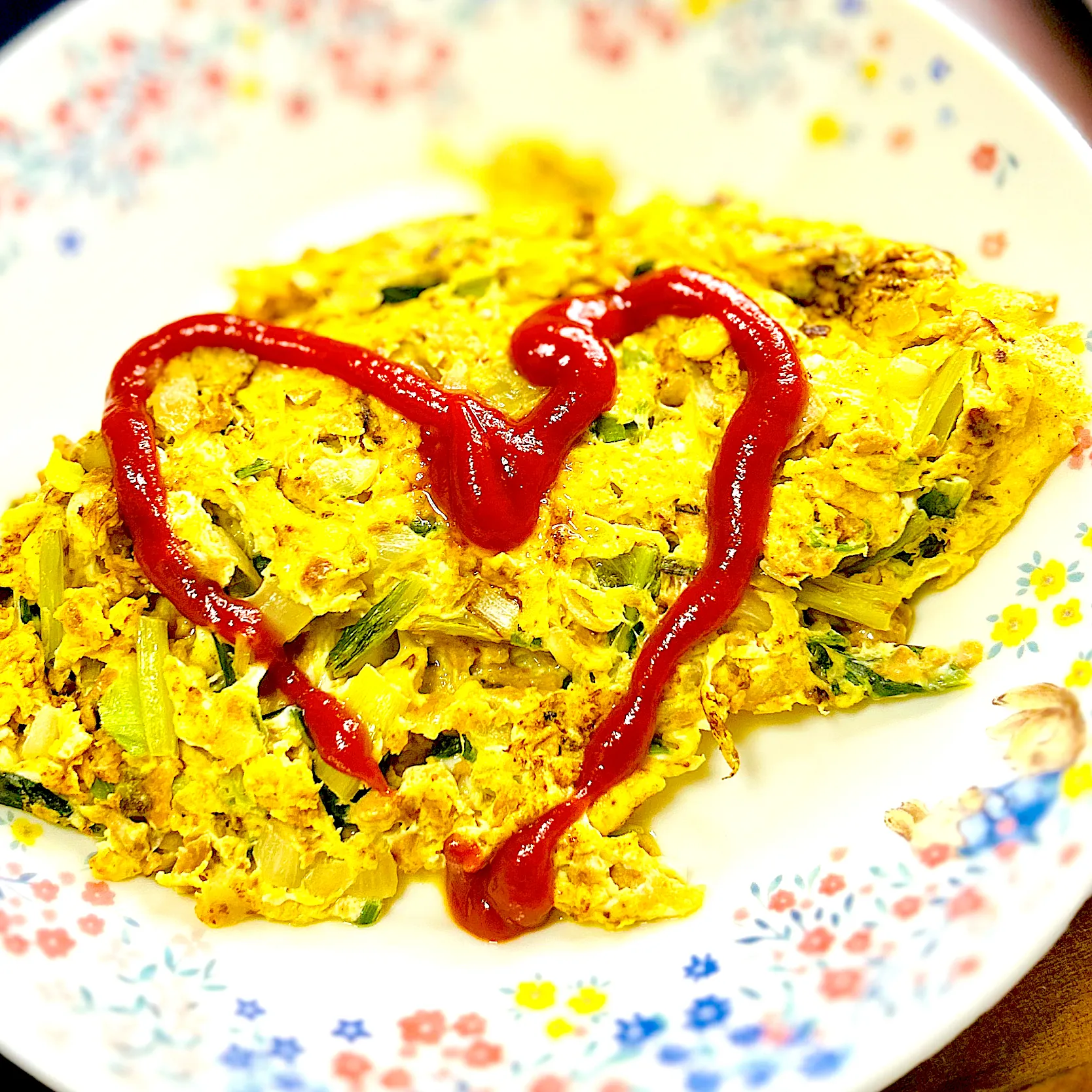 前回チャーハンを作ろうとして、大豆のお肉と小松菜と玉ねぎを炒めたら、量が多かったので、半分使って半分は残してました。で、残しておいた分を翌日、小ネギと卵を加えてオムレツに。ダーリンに出すのでなくても、オムレツのケチャップは♡にしてしまう癖が抜けません(笑)