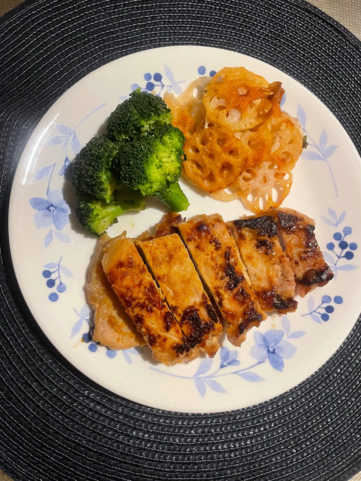 #今日の晩ごはん#もち豚の塩糀味噌漬け焼き#レンコンチップス#ブロッコリーソテー#ニラと卵のお味噌汁#私のおいしい写真
