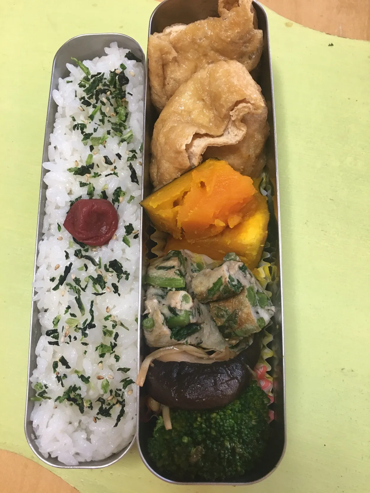 袋煮 カボチャ煮 きのこ炒め 春菊入りたまご焼き ブロッコリー弁当