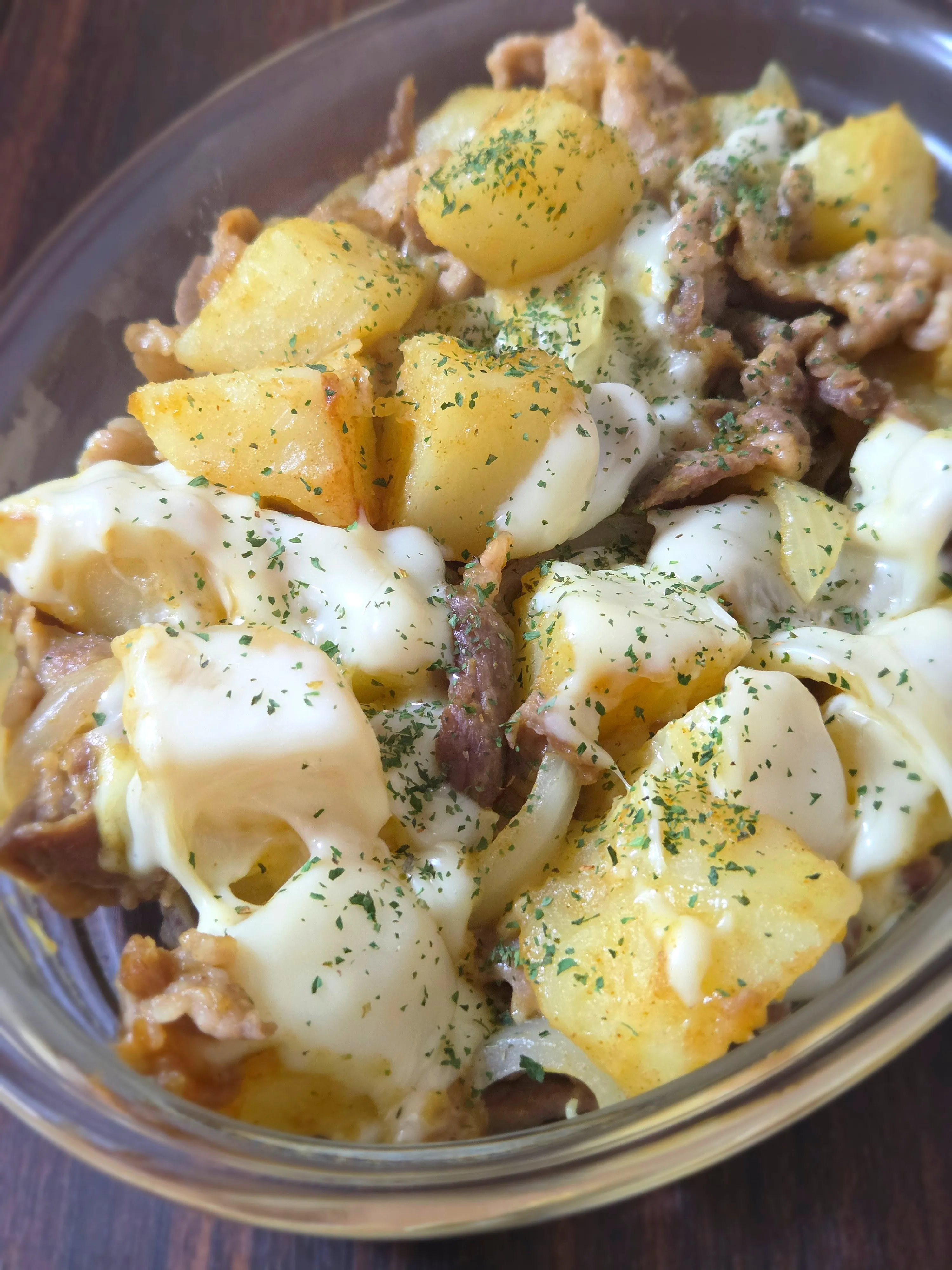 #晩ご飯 #じゃがいも #豚こま #玉ねぎ #カレー粉 #スライスチーズ