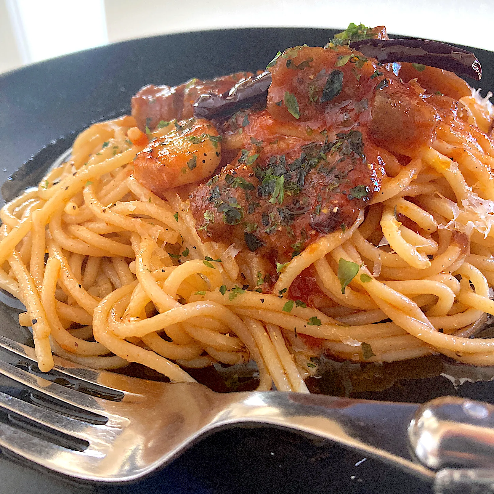 ぼっかけのタレとトマト味が混じり合って、いいスパゲッティソースになりました。