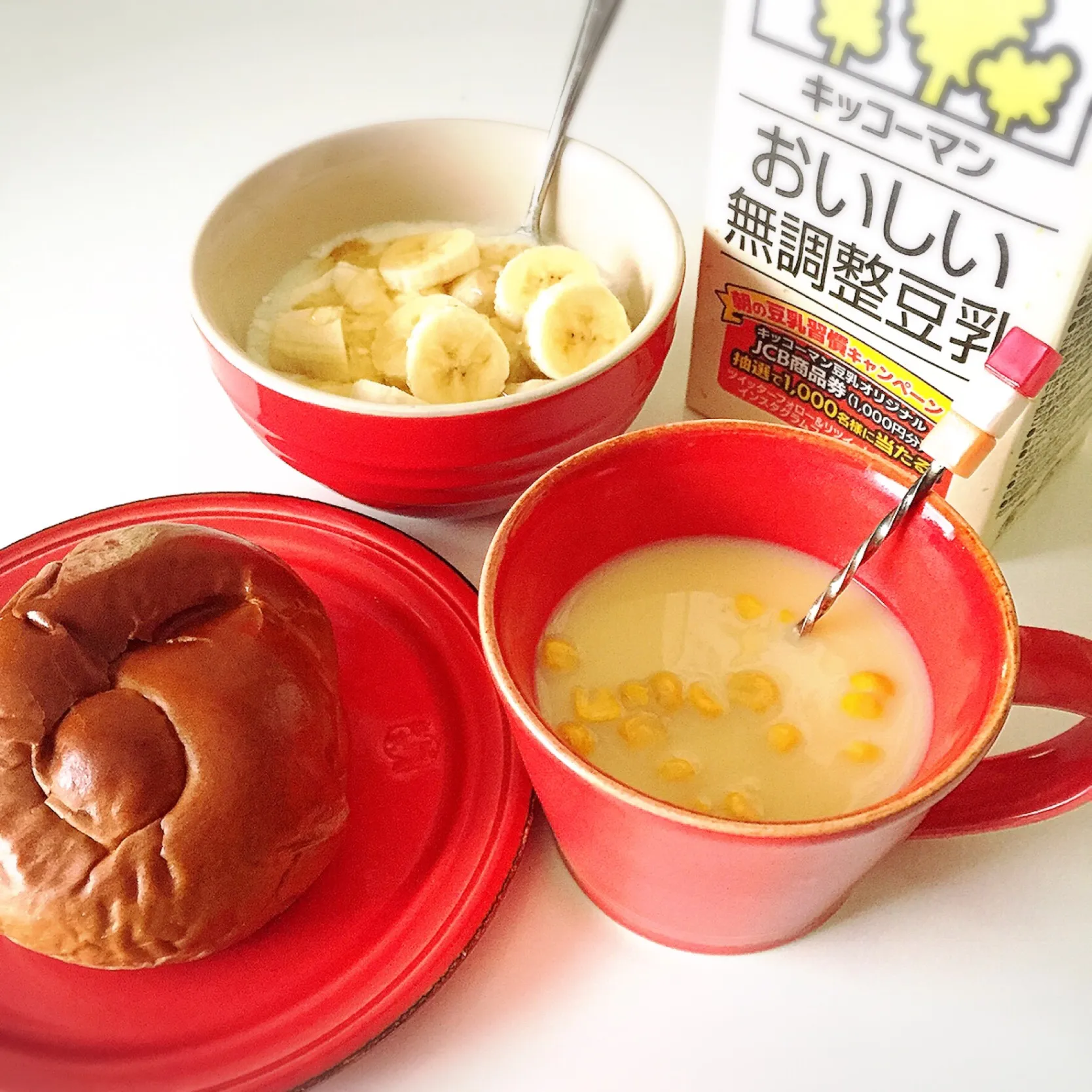 豆乳ケフィアにバナナ🍌、豆乳コーンスープ🌽