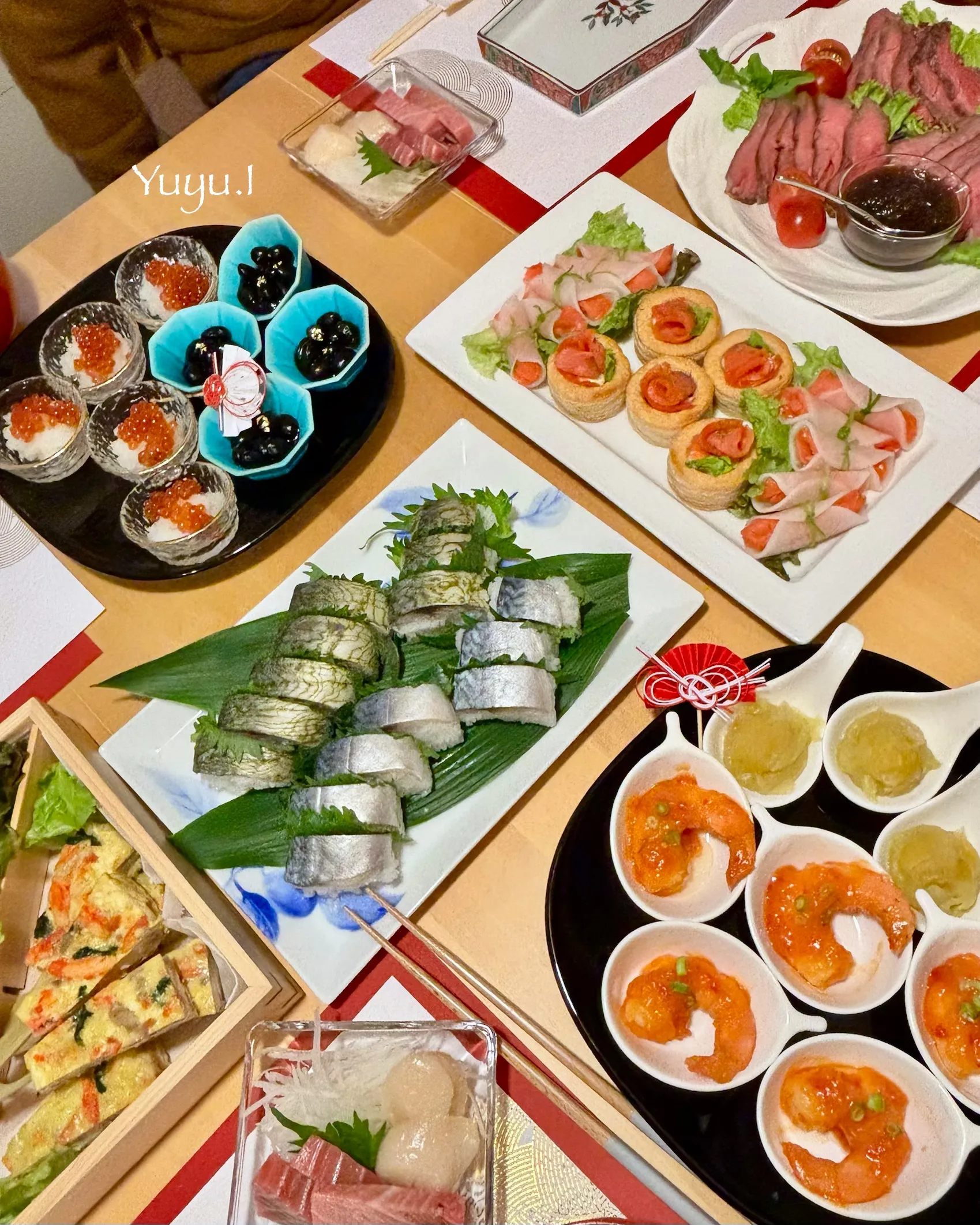鯖寿司(①で投稿済み)・黒豆・いくらおろし・エビチリ・栗きんとん・サーモン奉書巻なます・サーモンパイ・煮しめ・田作り・ローストビーフ・昆布巻き(写ってないけど😅)