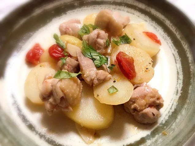 美味しそうなジャガイモをいただいたので、鶏ももとトマトで蒸し焼き。
