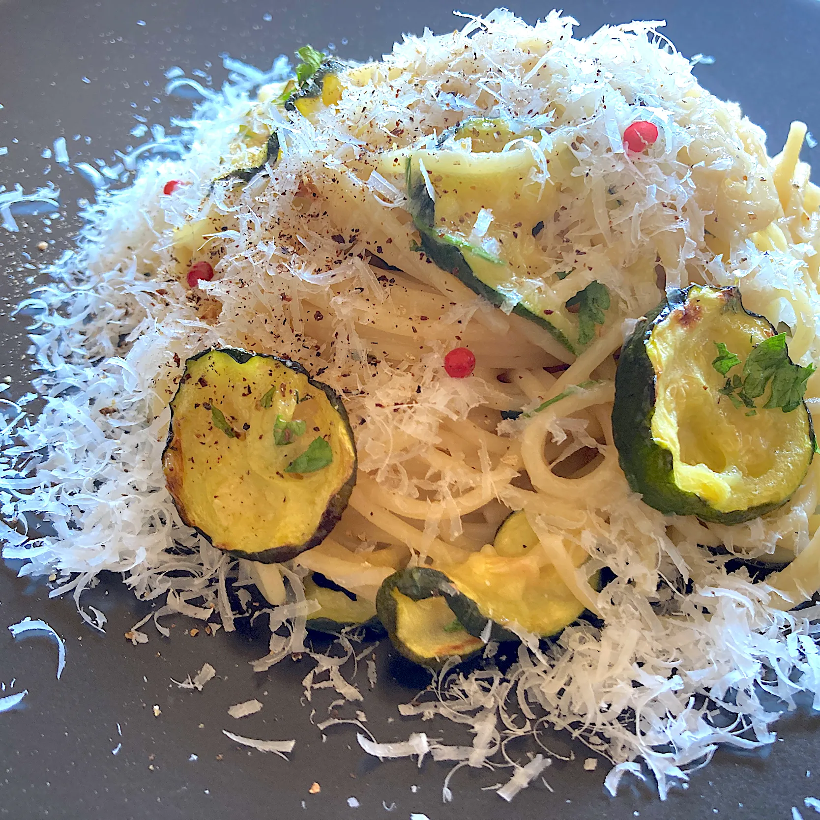 ズッキーニを素揚げしてスパゲッティに和えた一皿です。