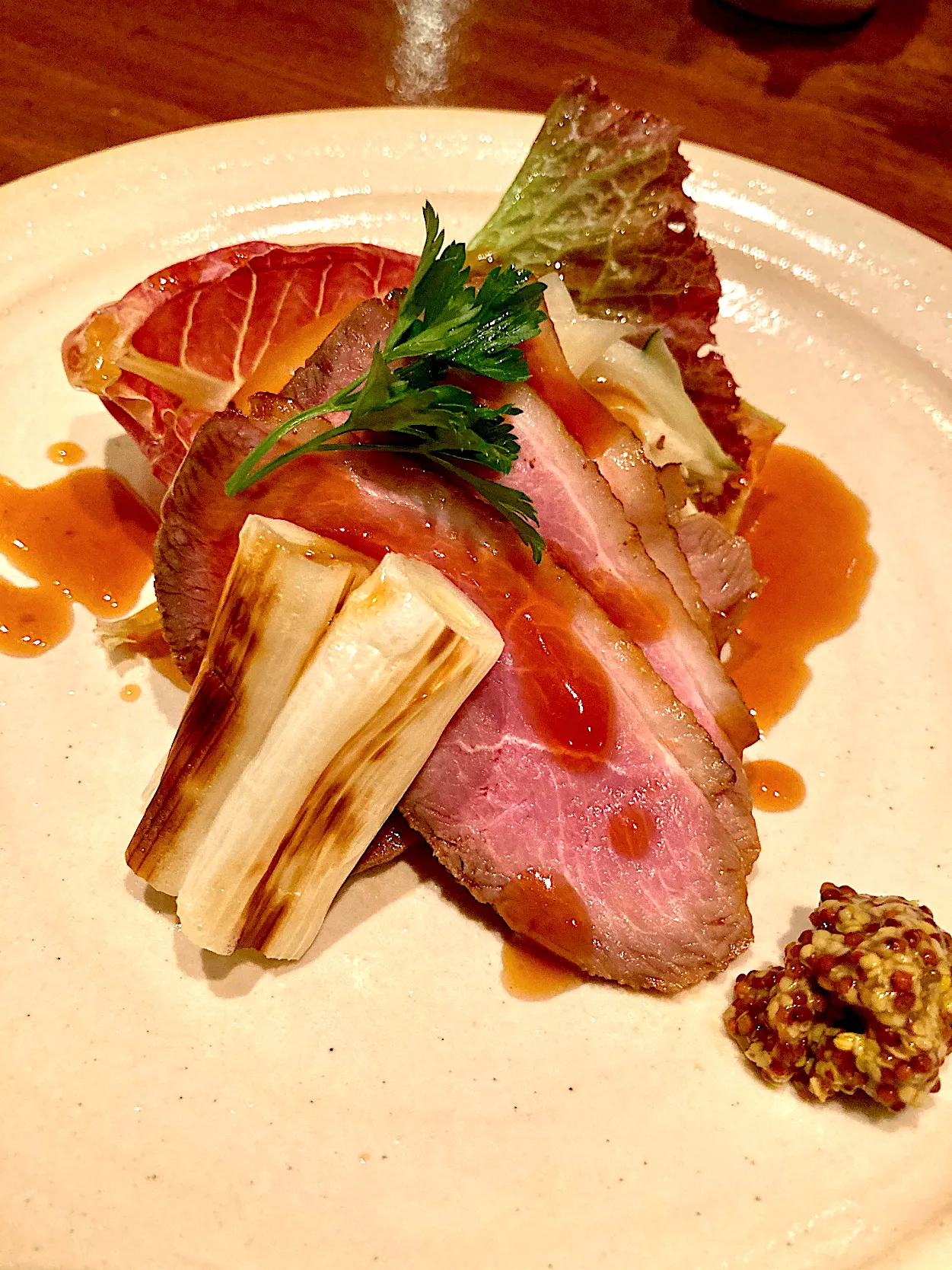 鴨ロース   芹と赤葱、おろしたての山葵を添えたサラ...