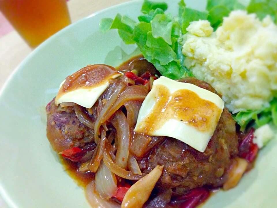 煮込みハンバーグ。しかしケチャップ無くてトマト潰して代用。でもその方のが美味しい:)
