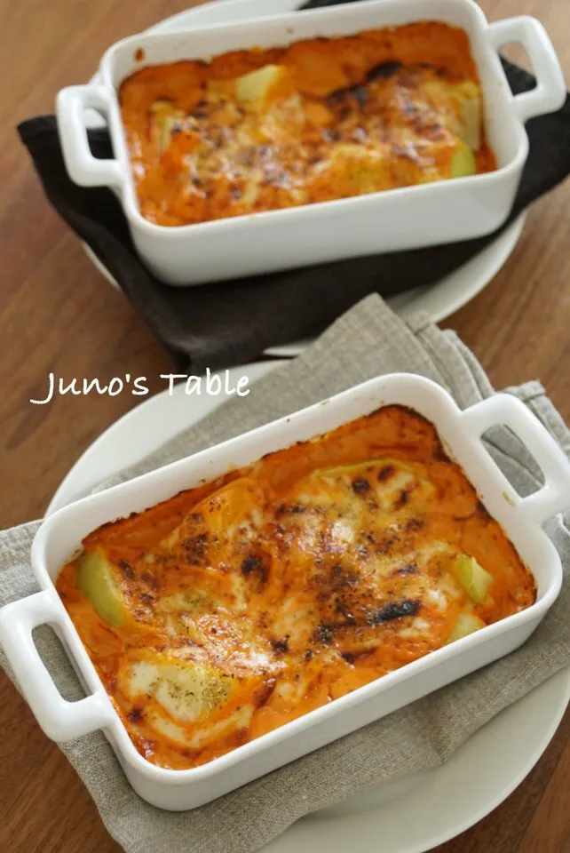昨日のトマトのパスタソースが残ったので、生クリームを加えてのばして、グラタンに。