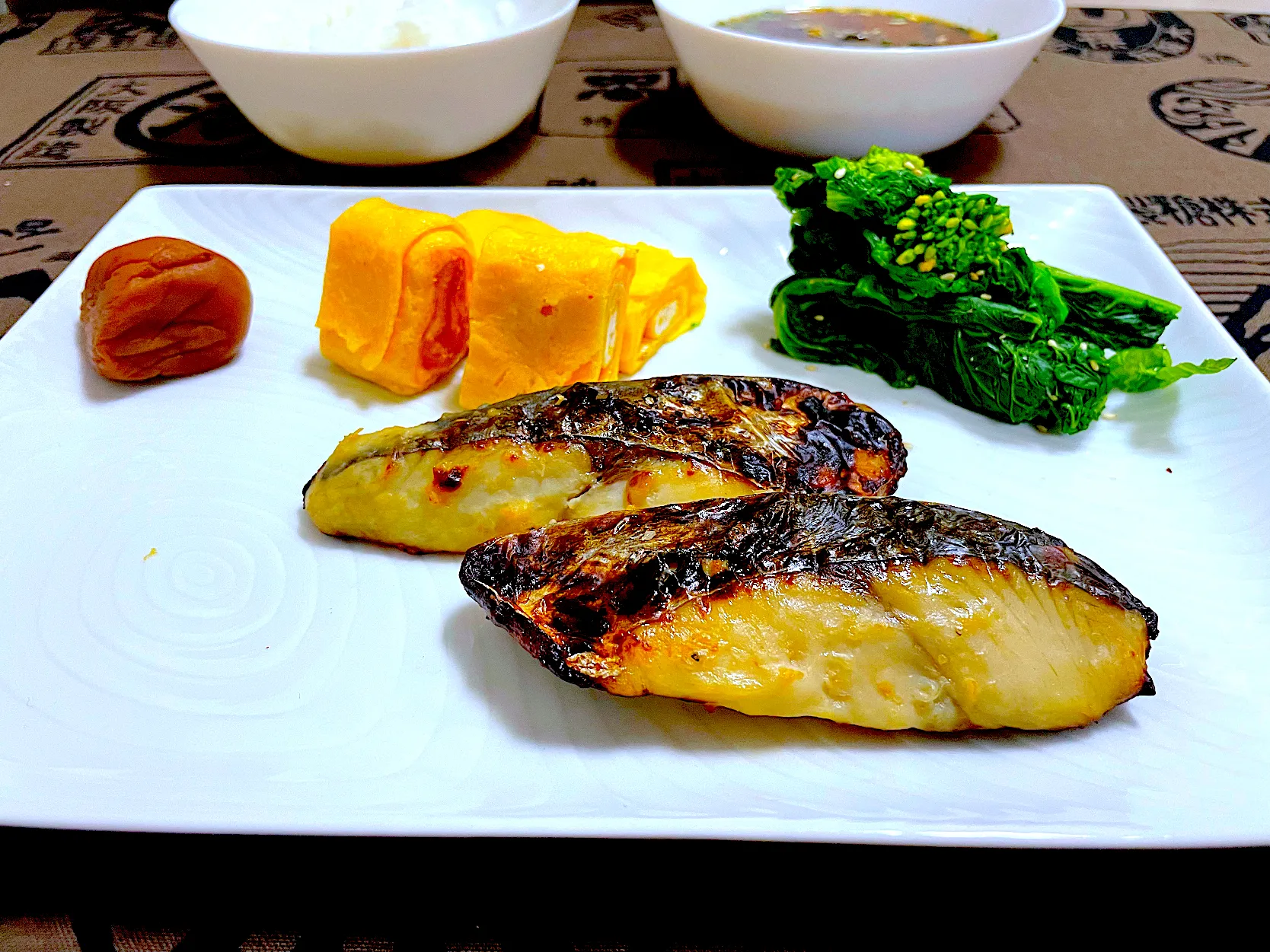 付け合わせは、菜の花のおひたし、玉子焼き、梅干し、わかめと豆腐の味噌汁。