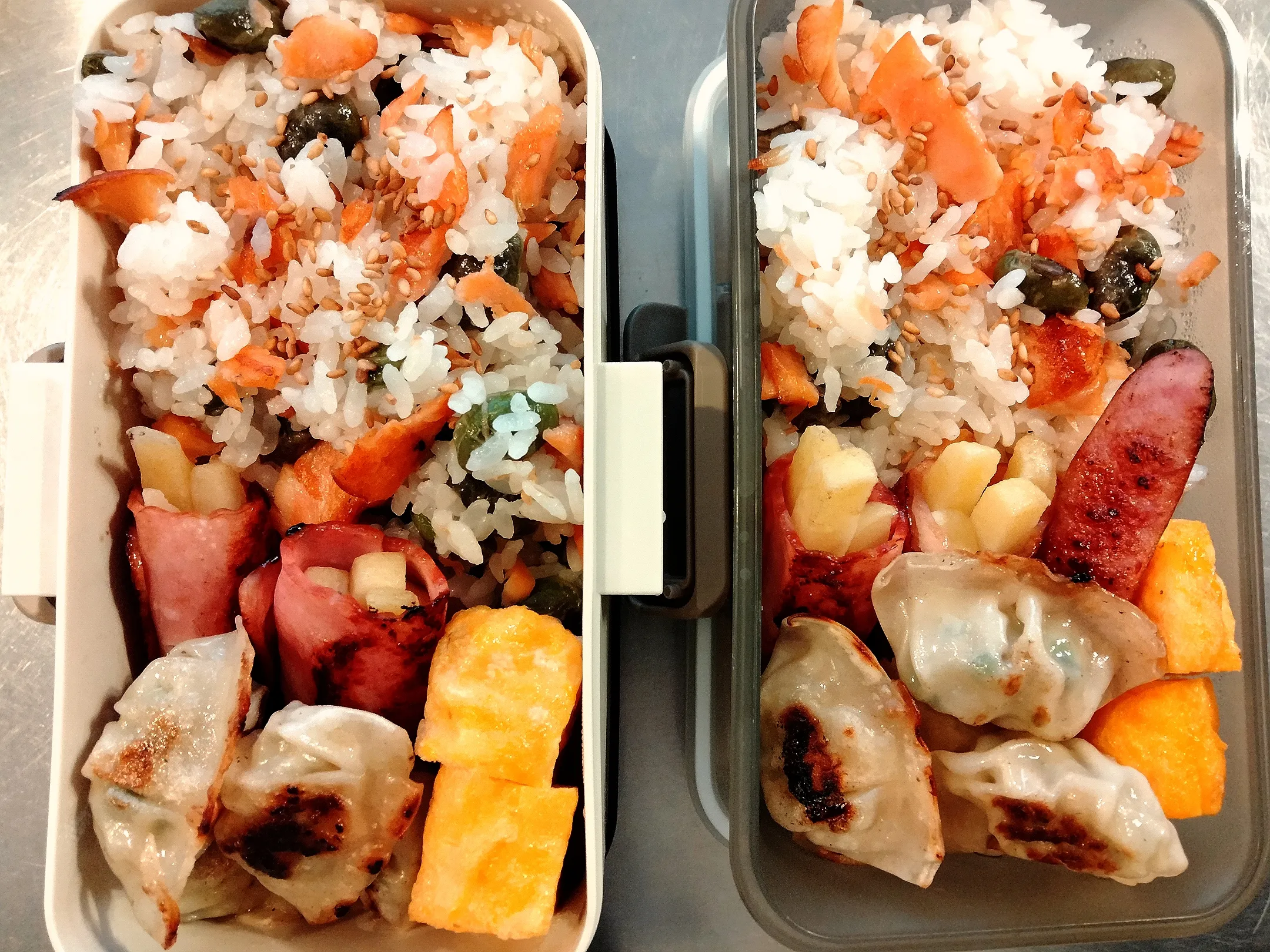 #鮭 #お弁当 #コストコ購入品 #ポテトのベーコン巻き #卵焼き #冷凍餃子 #枝豆 #黒枝豆