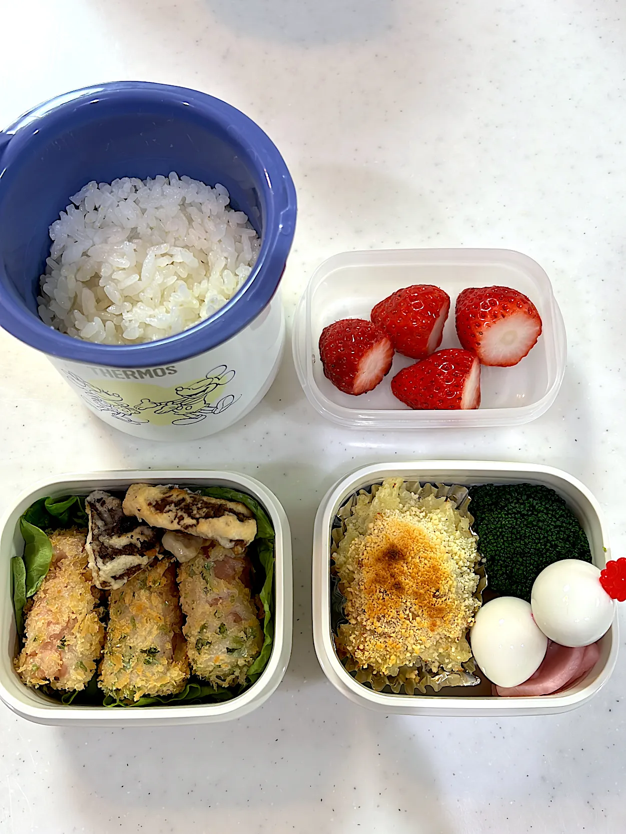 ソーセージカツ、椎茸のフリッター、チーズポテト、ゆでブロッコリー、うずらの卵、梅大根、いちご