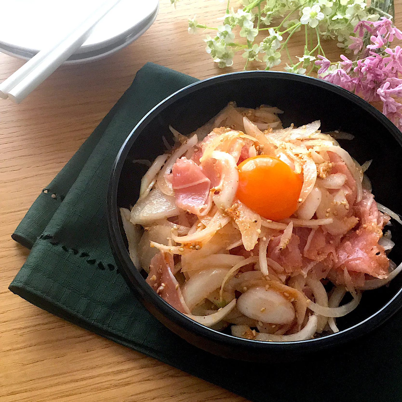 生ハムの塩気、新玉ねぎの甘み、ごま香るユッケ風味が絶妙にマッチ👍