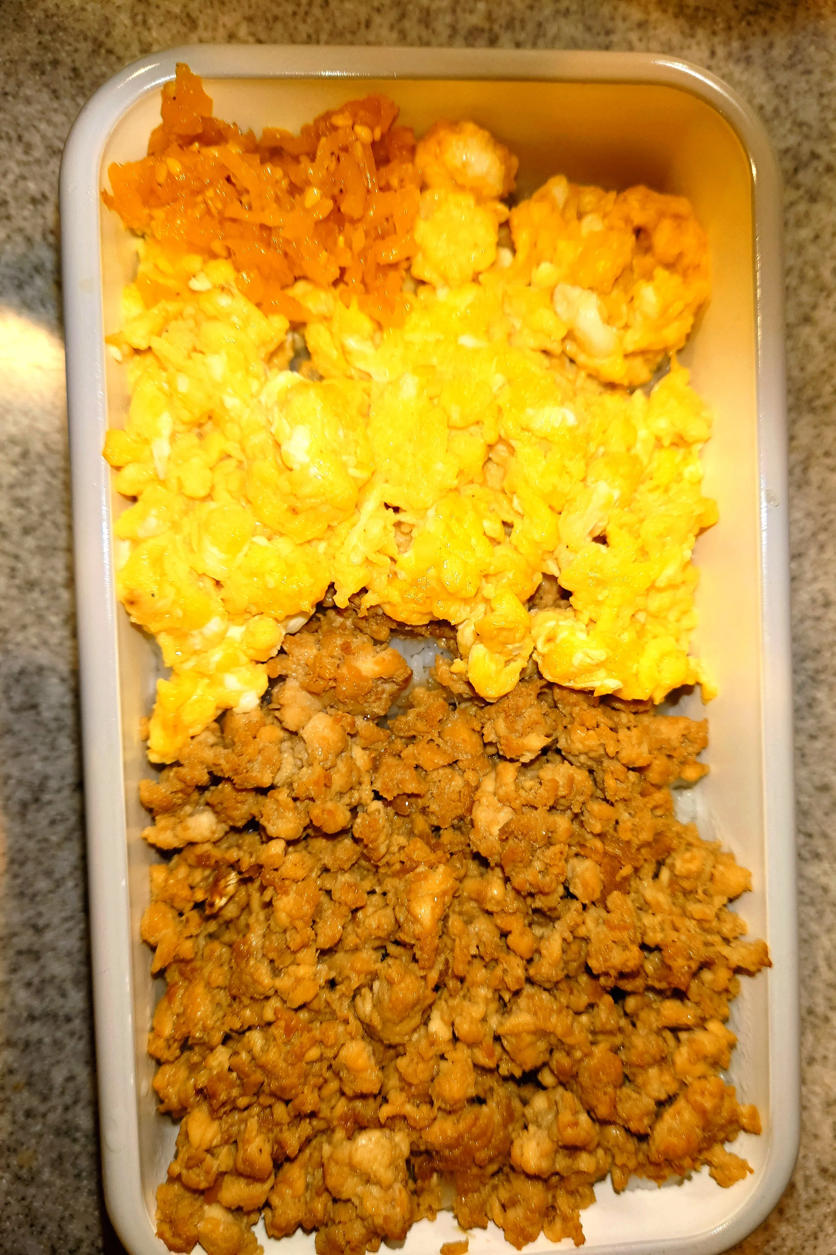 そぼろ:鶏むねミンチ、生姜、甘露醤油、酒!三温糖