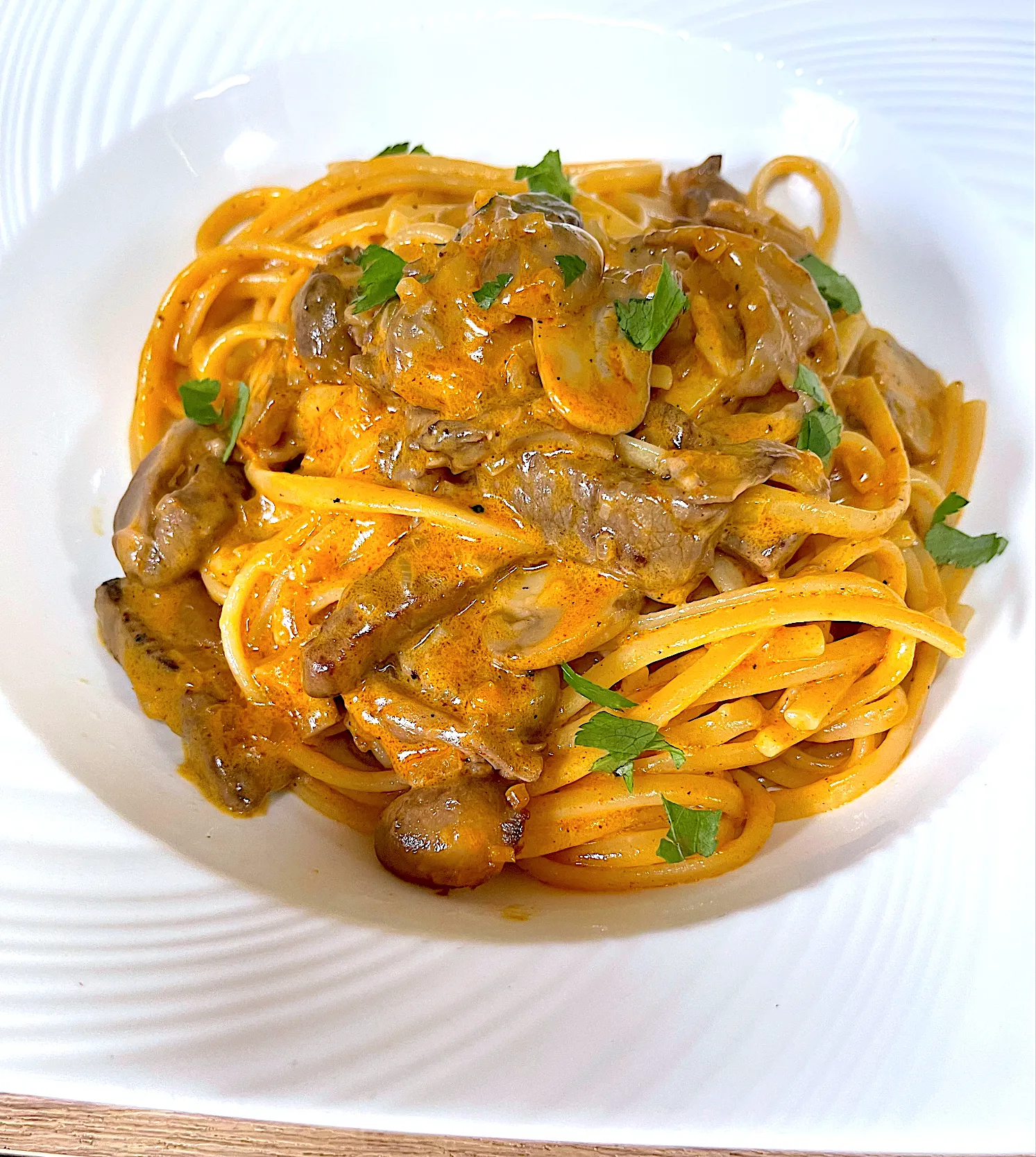 昨夜の残りのストロガノフにトマトペースト入れて茹で汁で伸ばし、パルメザンチーズ バターを足してパスタにしました。