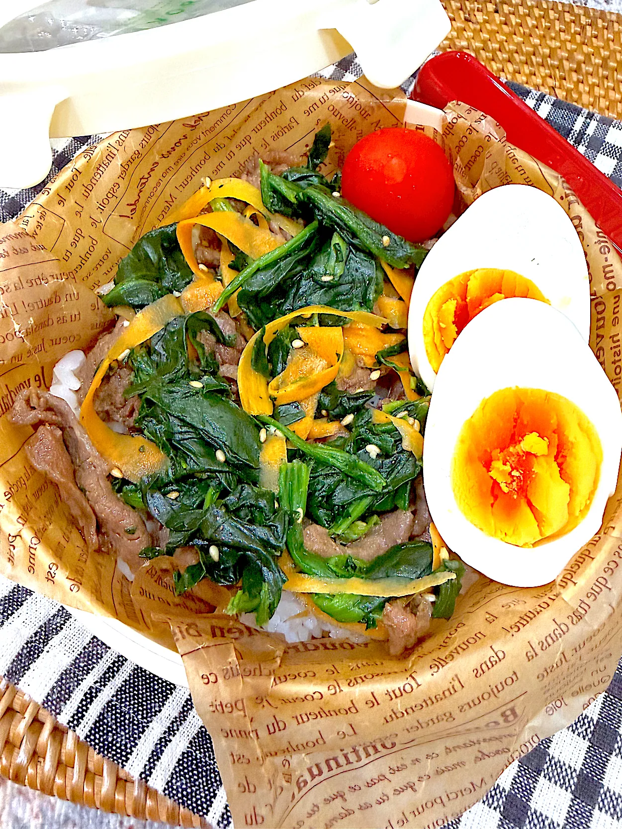 ご飯にのせてゆで卵とミニトマトで彩りよく♡