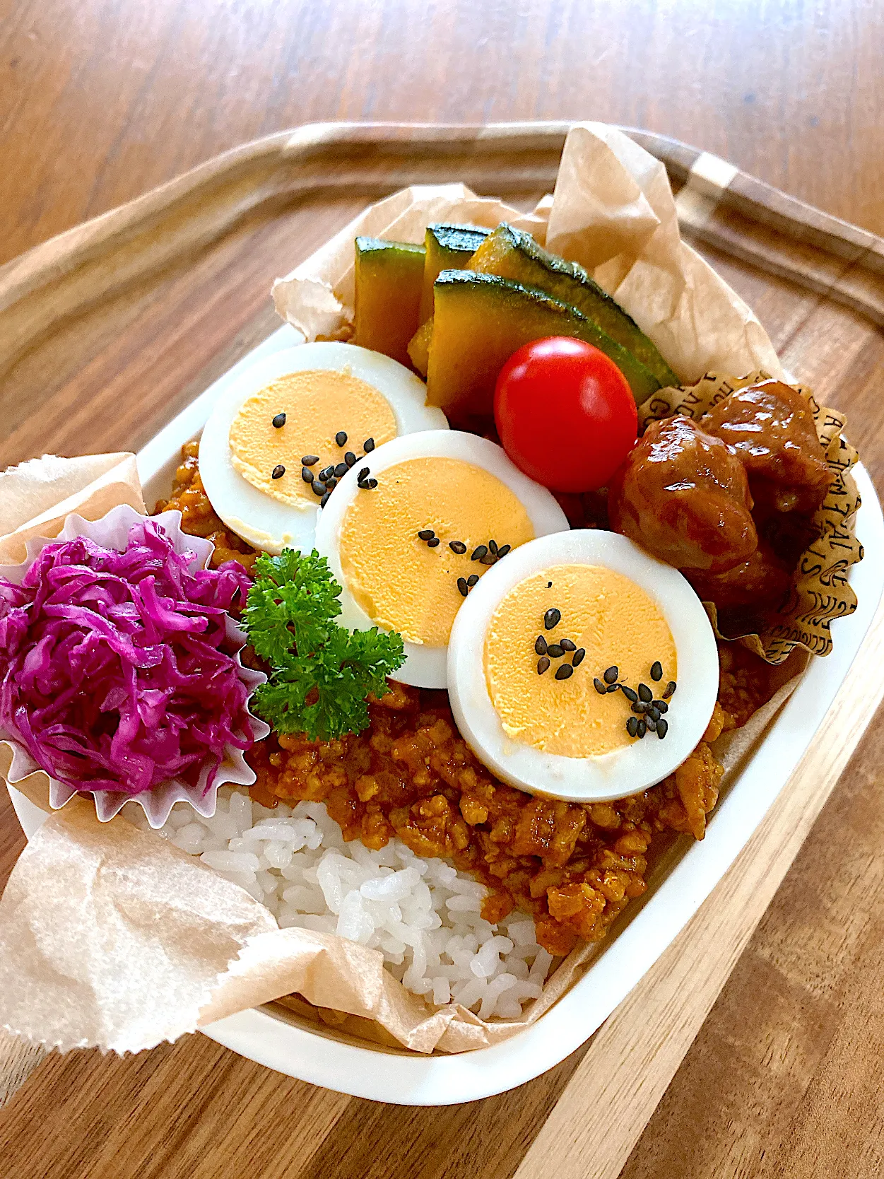 #ドライカレー #かぼちゃのバターソテー #ゆで卵 #紫キャベツのラペ #ミートボール #家庭菜園ミニトマト #お弁当