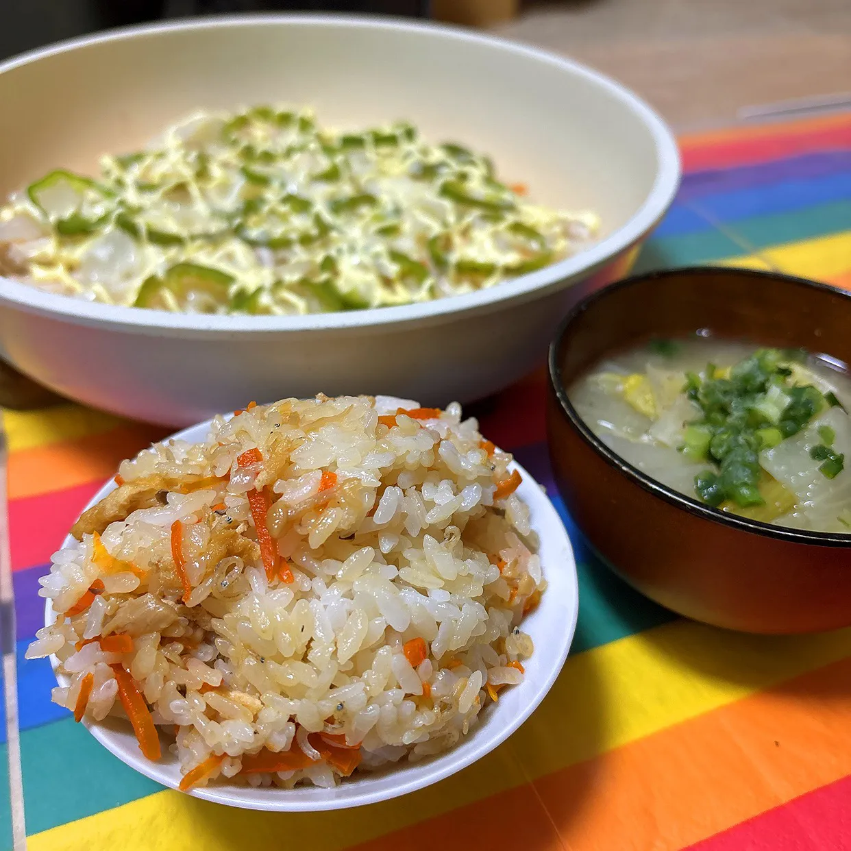夕飯*こぎつねごはん・ニラ玉スープ・鯵の天ぷら・白菜...
