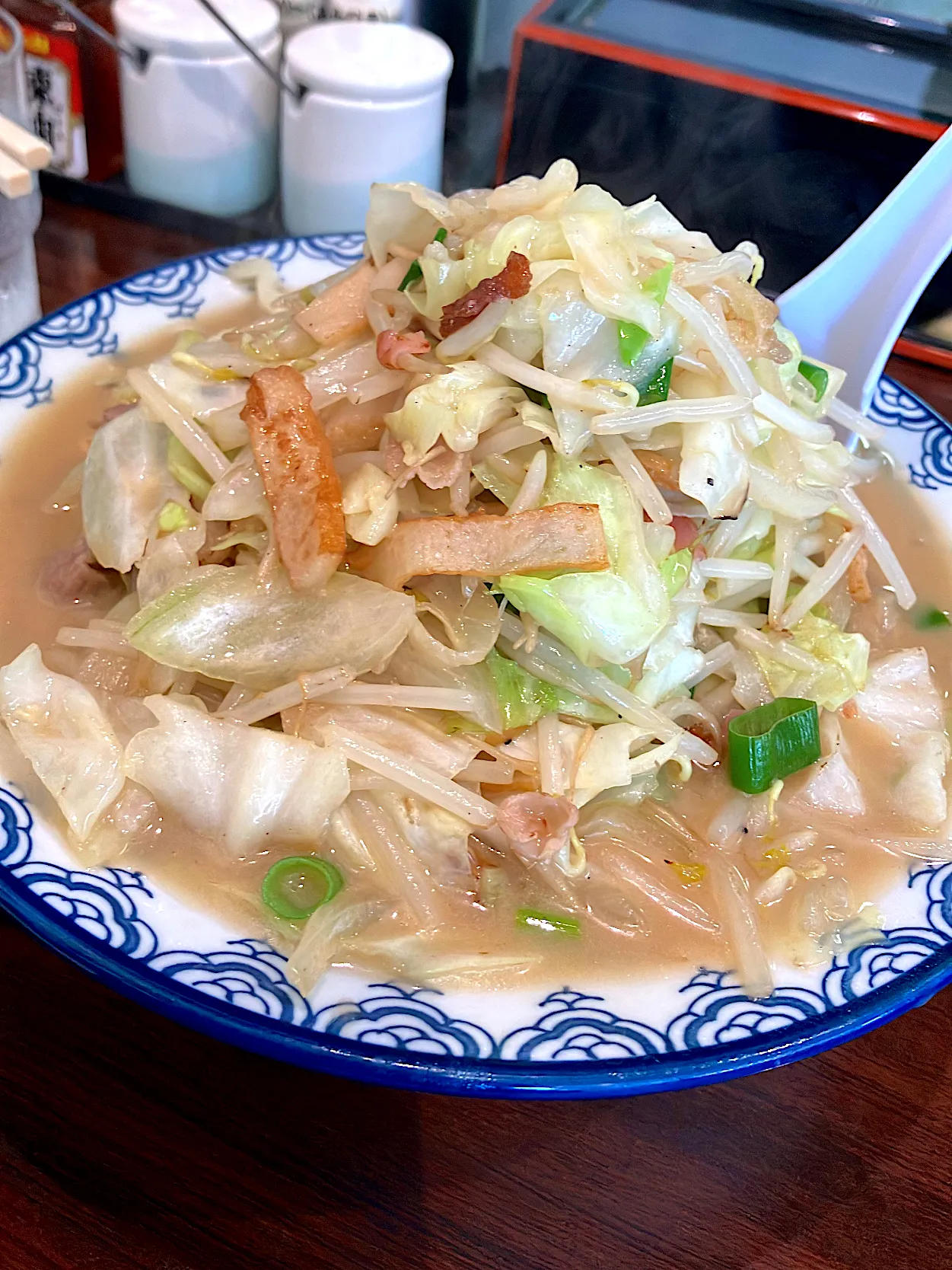 #ピンクのかまぼこが野菜に埋もれてる#野菜の切り方が抜群#炒め方が抜群#出汁がトンコツなのでわたし的にはイマイチ#普通盛りでも野菜が凄い量#野菜増し食べたら大変#行列のできる老舗ちゃんぽん屋#佐賀県武雄市本店#井出ちゃんぽん