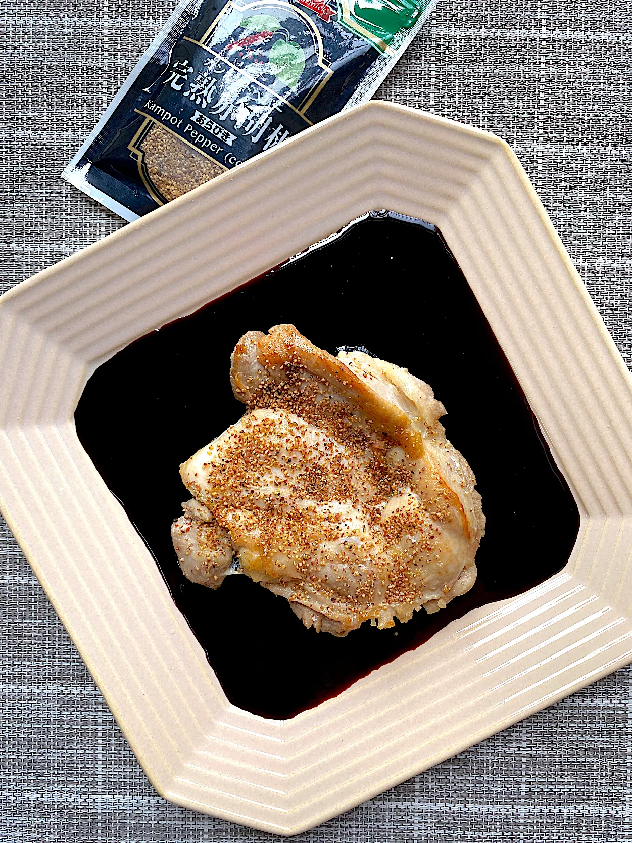 カンボジアの完熟赤胡椒、カンポットペッパーは爽やかでキレの有る辛味が特徴、コンソメベースにたまり醤油の甘味のソースと相性抜群!