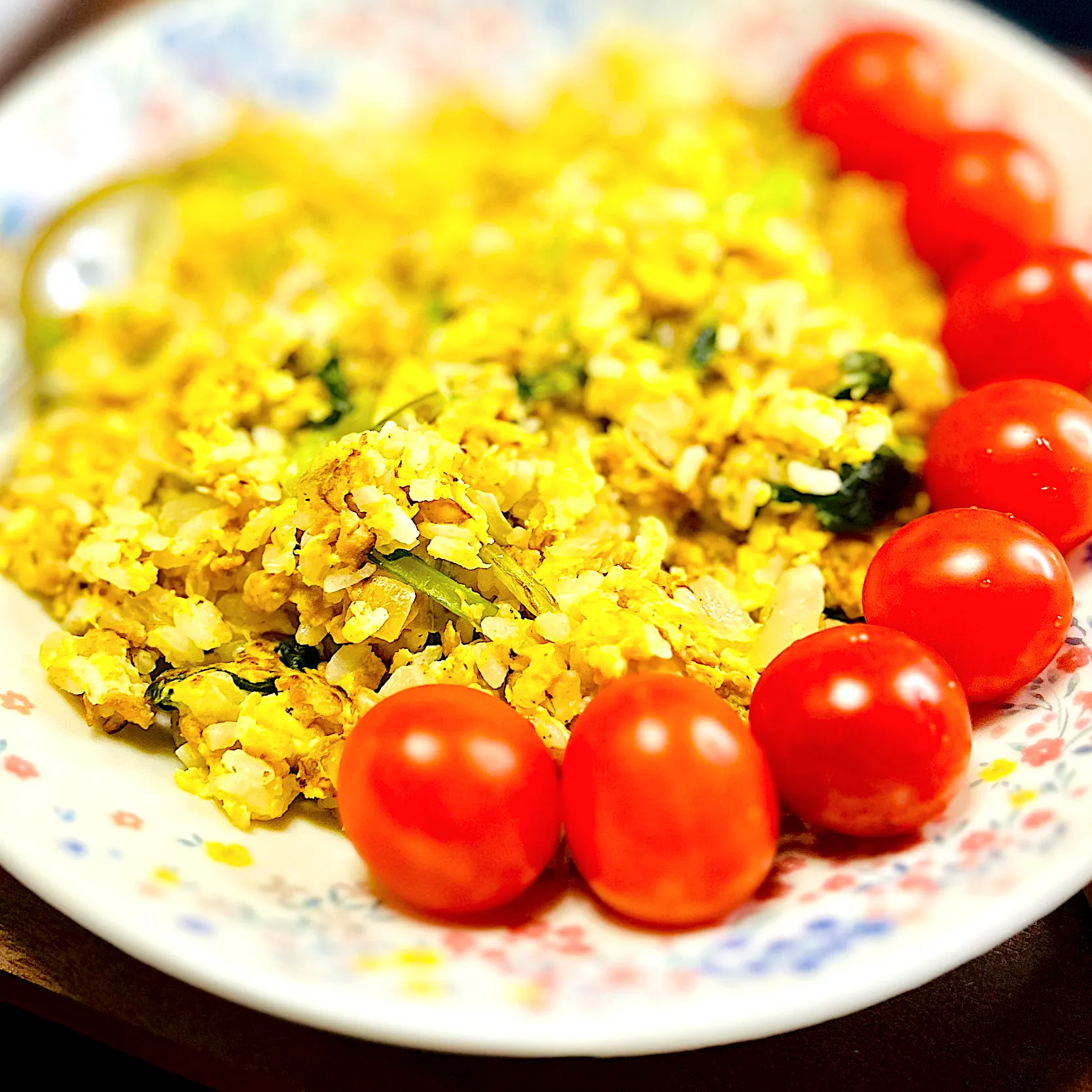 大豆のお肉と小松菜のチャーハンにプチトマト