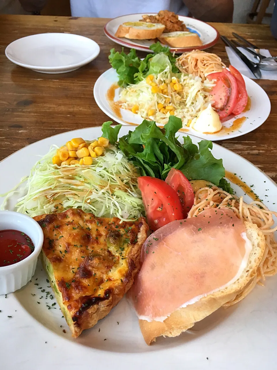 枝豆と新玉のキッシュのワンプレート サラダ、チリビーンズ