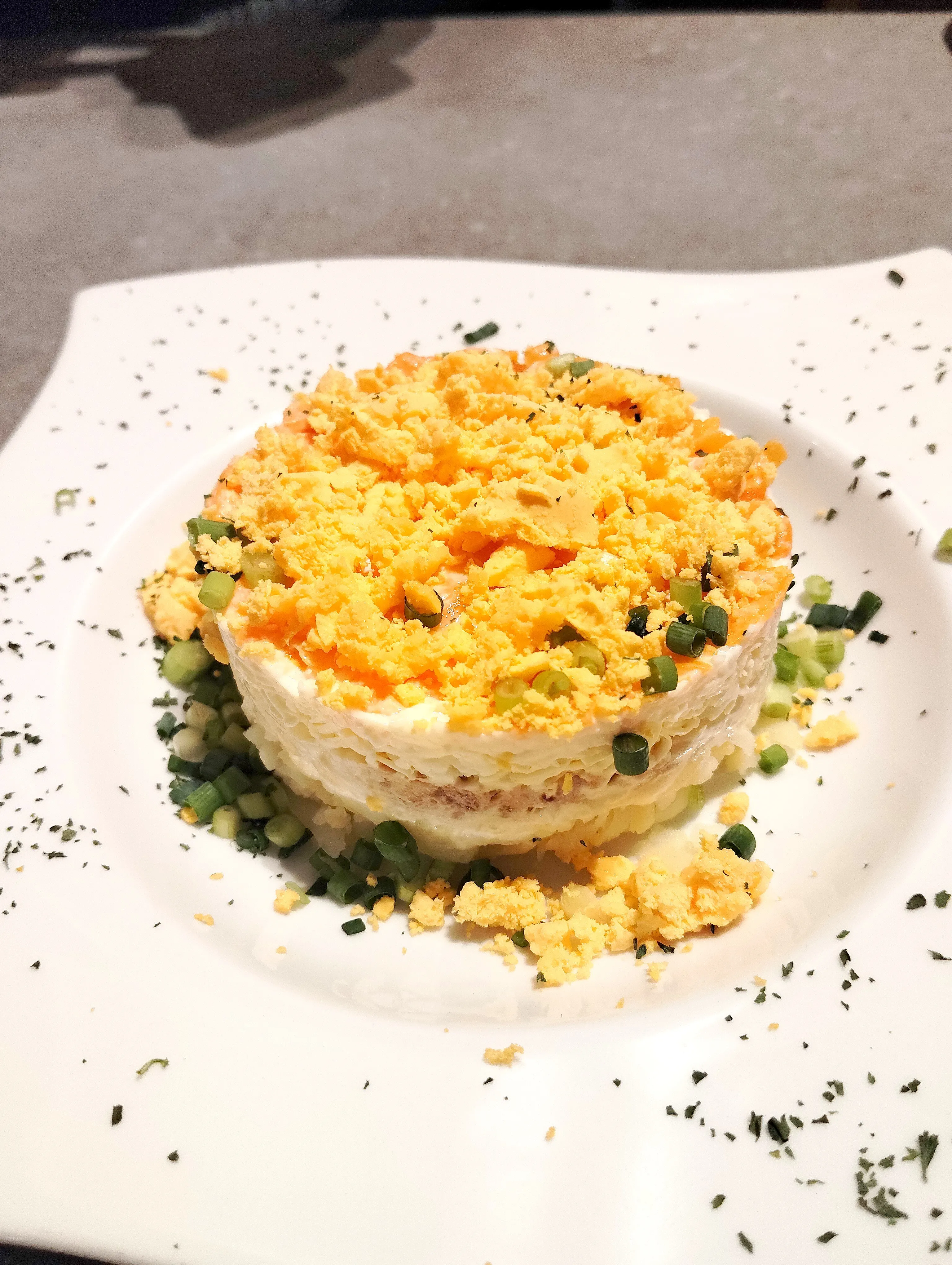 ポテト、ツナ、サバ、チ―ズを層にして最後に卵黄でミモザに見立てたサラダ😀とても美味しかったです!