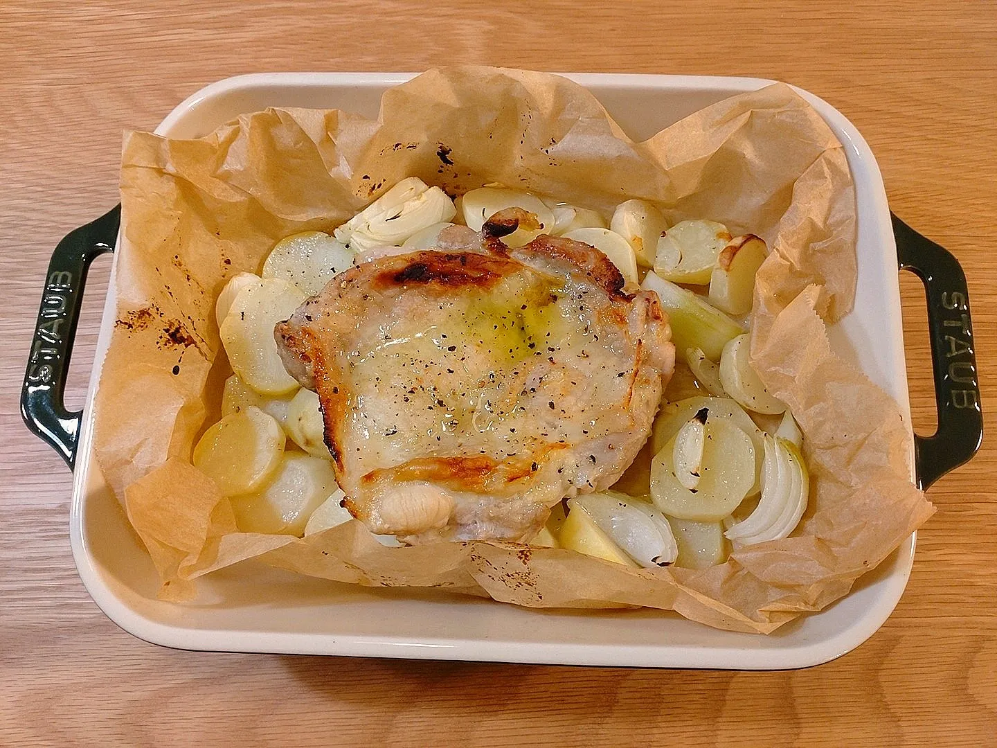 「プラス糀 にんにくしょうが 生塩糀」で漬けた鶏もも肉を、玉ねぎとじゃがいもに乗せてオーブンで焼きました😊